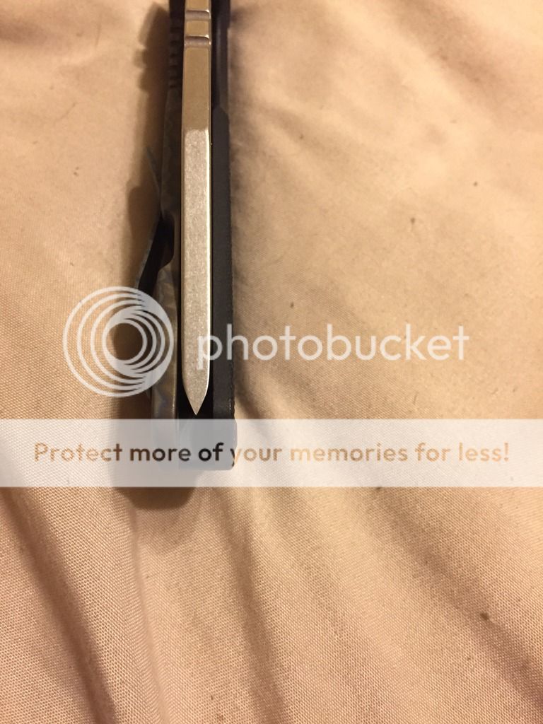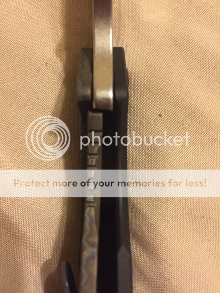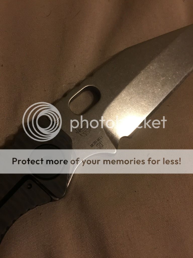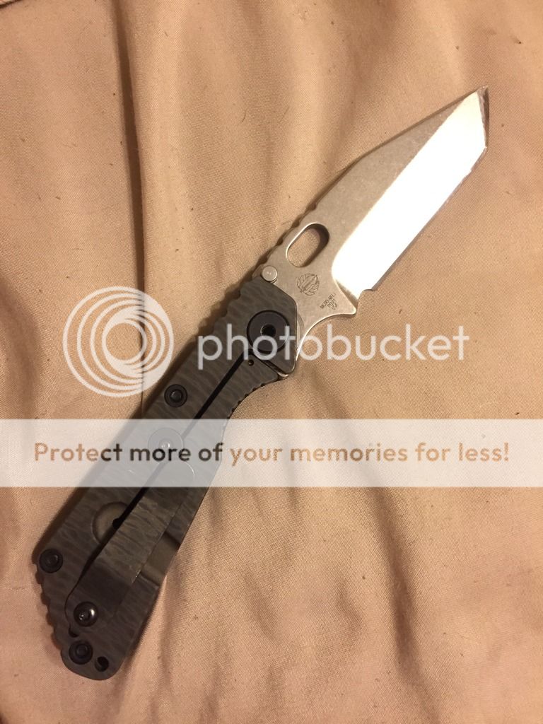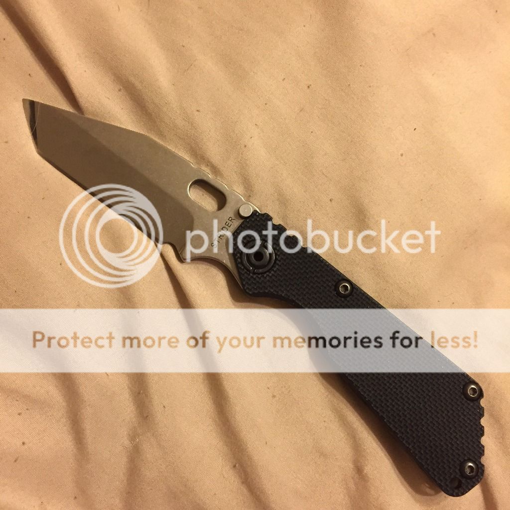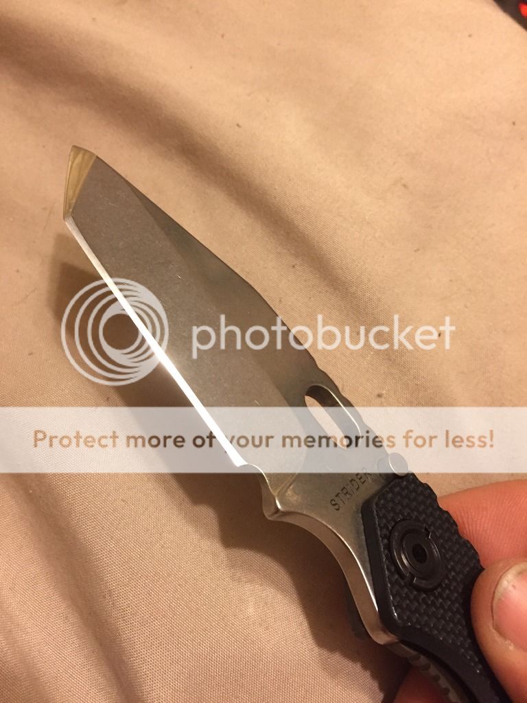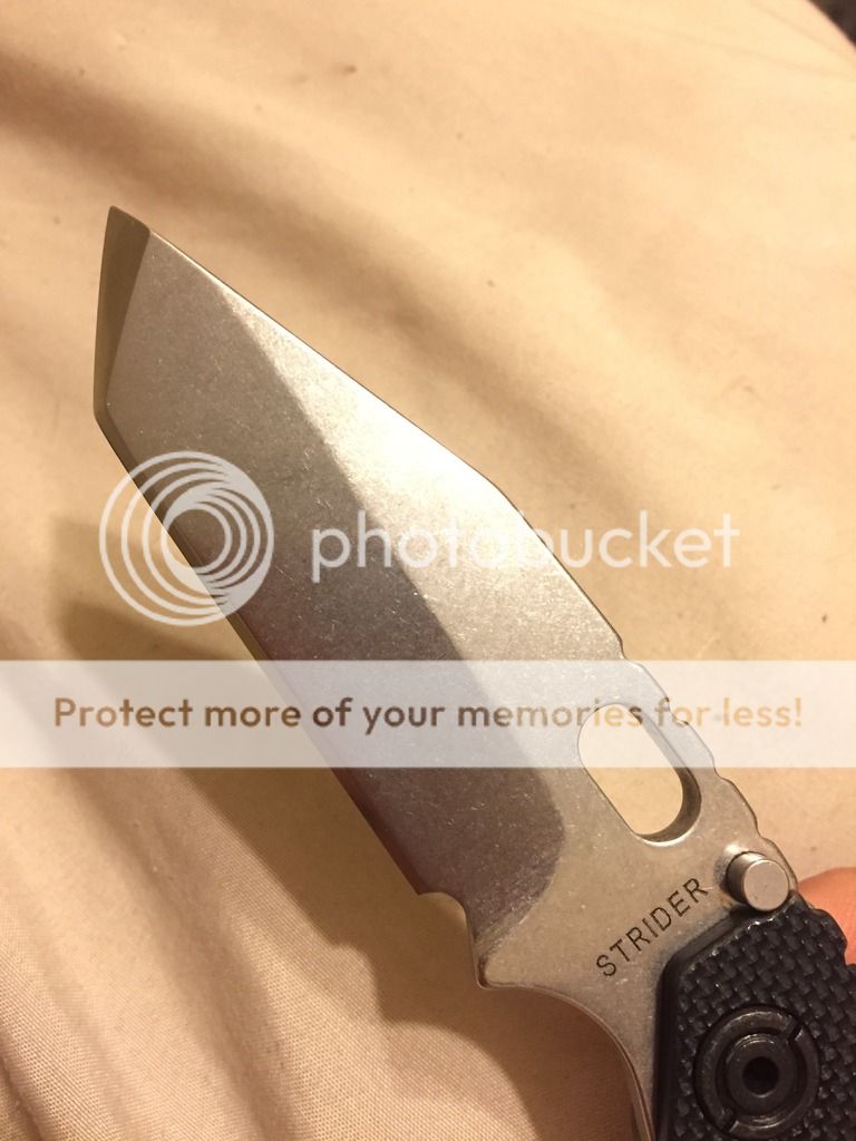 Strider SNG Tanto in Micro Melt Pd1. Comes with a nice shaving sharp edge. Functionally speaking its the perfect specimen- Nicely centered, silky smooth (blade drops free when the lock is disengaged), absolutely rock solid in all directions, and the lock up is around 50%. Has seen light use and shows some signs of carry on the lock side.