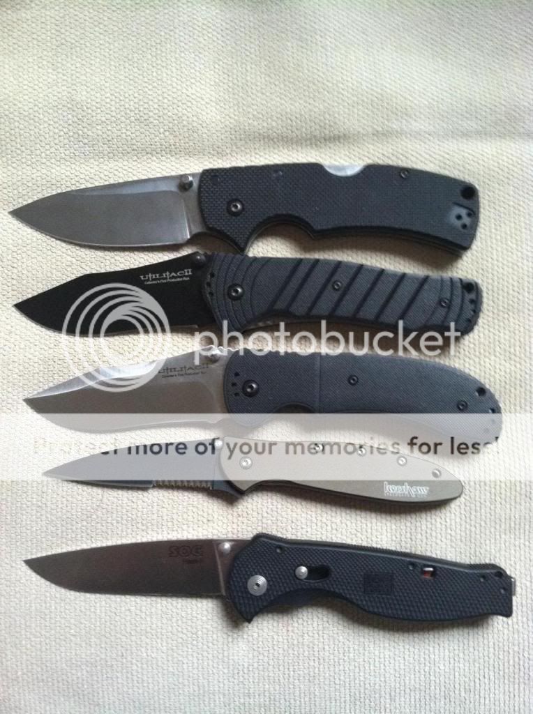 Cold Steel Recon 1: stripped blade/lockbar. Has been carried and used but edge is in great shape. The g10 has started smoothing a little bit with age but to me it carried better and doesnt shred the pocket like a new one does. It is centered, smooth, and locks up solid. $40 shipped/paypal