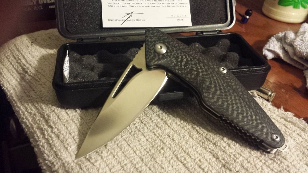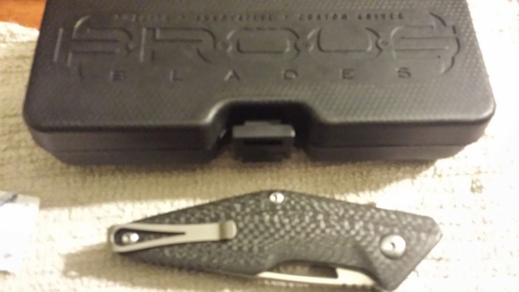 Also just got this today after waiting almost a month a brous blades mini division carbon fiber. I have not seen another carbon fiber mini-division any were. I just have other things im after. This is D2 steel carbon fiber handles and titanium liners. This is a much more pocket friendly version then the full size but is still a good size knife. The blade comes with very nice case never used only flipped a few times satin blade. Looking to get $300..now for some pics..may take trades on this for similar value knifes