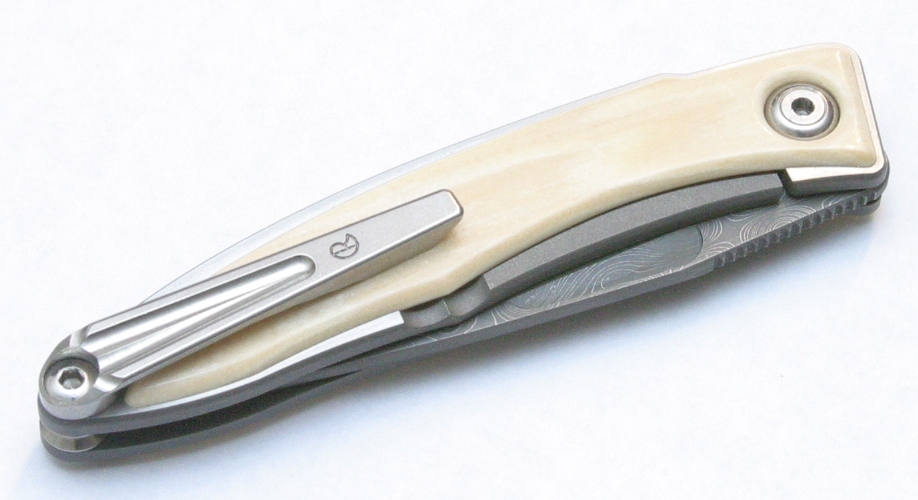 :thumbup:This knife is MINT. Perfect in every way. DOB: Nov. 21, 2011. Creamy Mammoth Ivory has a depth and translucence that is breathtaking to behold. I have spent much time indeed just staring at it and fondling it. Perfectly centered. The Blade is Devin Thomas stainless raindrop damascus and it has a really cool star that jumps out at you right in the middle of the blade. I wish I didn't need to sell it but I'm trying to balance my books for the new year and zero out my debts and knives and so a few have to go. This one is probably my nicest and most expensive knife that I will never use so my practical side is forcing me to sell it - reluctantly. Of course comes with everything as new: box, BD card, papers, chamois, sticker, tool, and leather slip case.