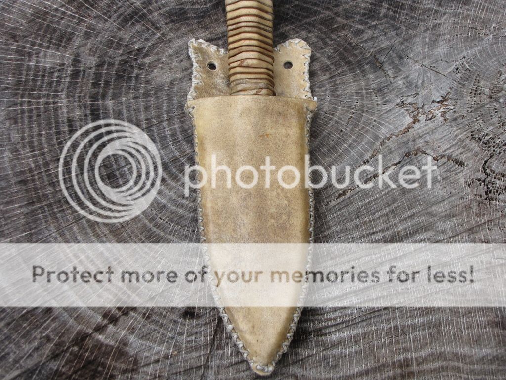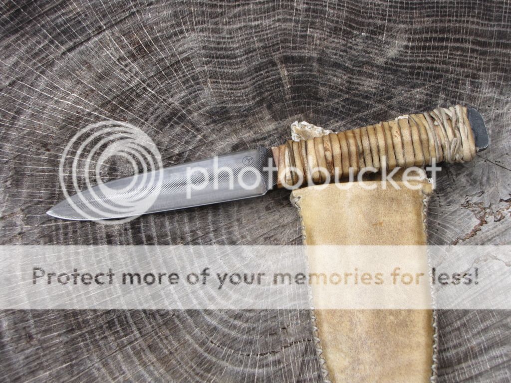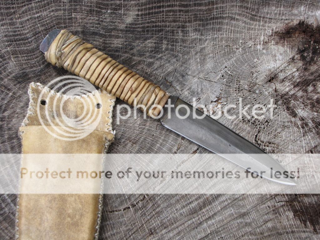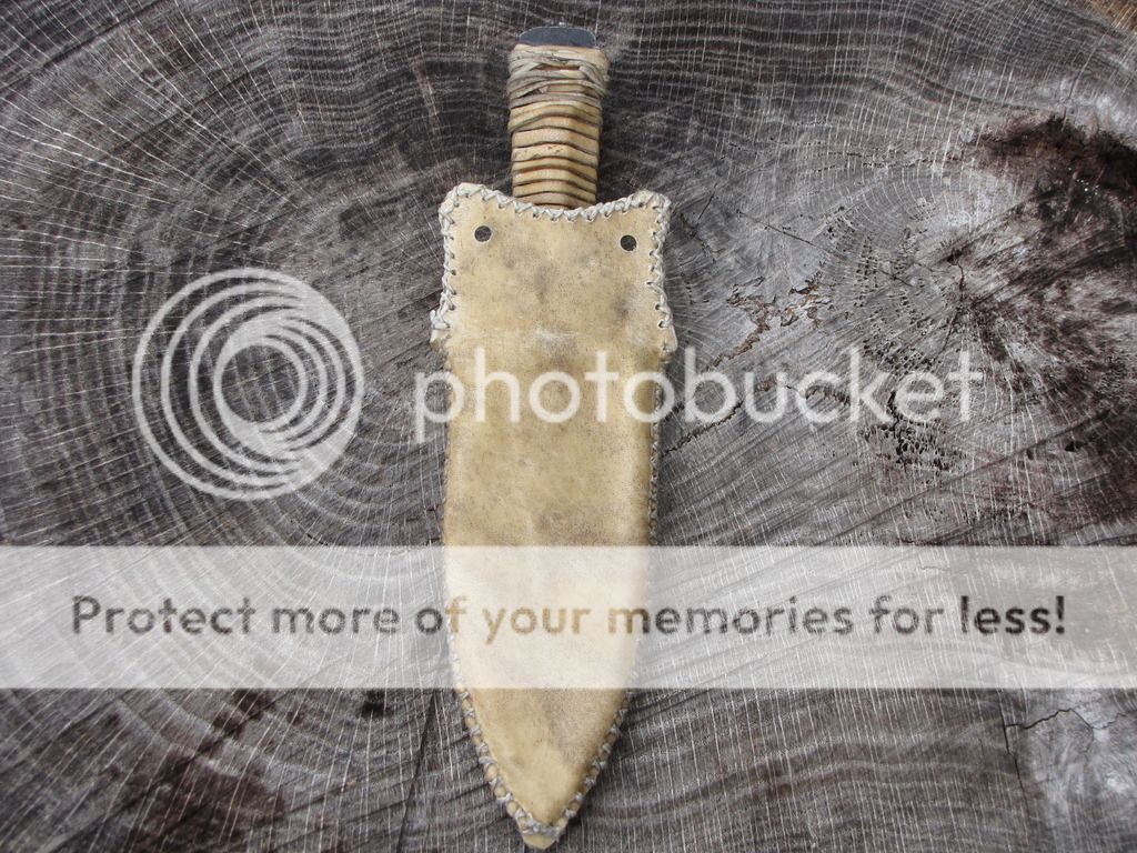 Here is a Primitive Dagger forged from an old Nicholas file. The blade is 4". It has been etched. The handle is 4" and is wrapped with deer rawhide that I made myself. There is vegetable tanned leather under the rawhide to give the handle some contour. The sheath is rawhide from the same deer with a vegetable tanned insert, lined with pillow ticking. Can be used for neck knife, patch knife, ect.