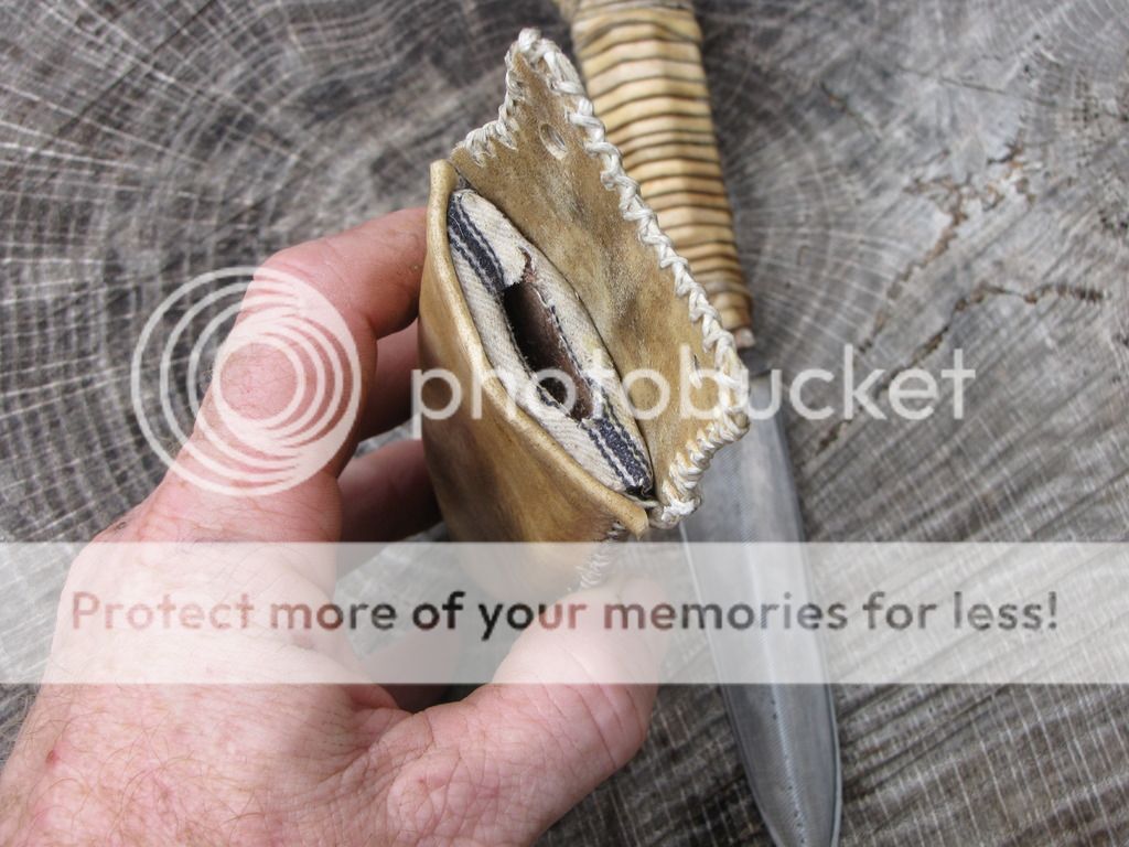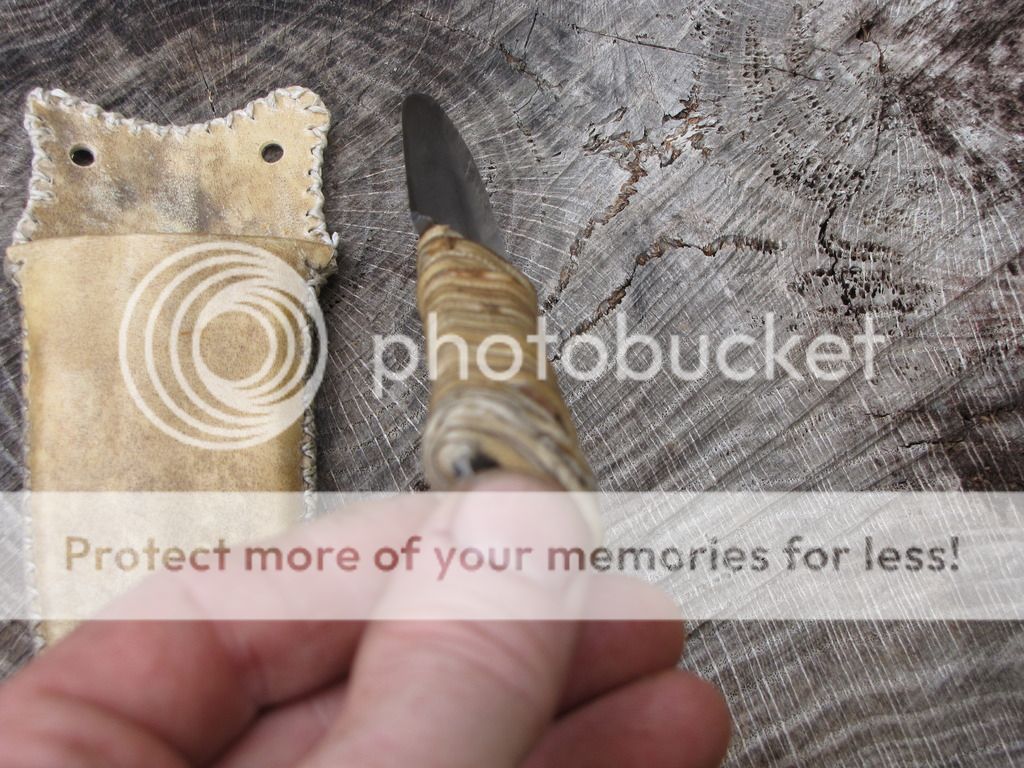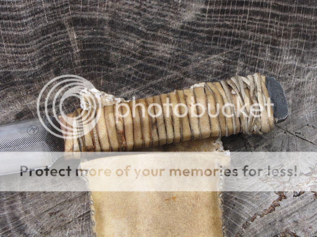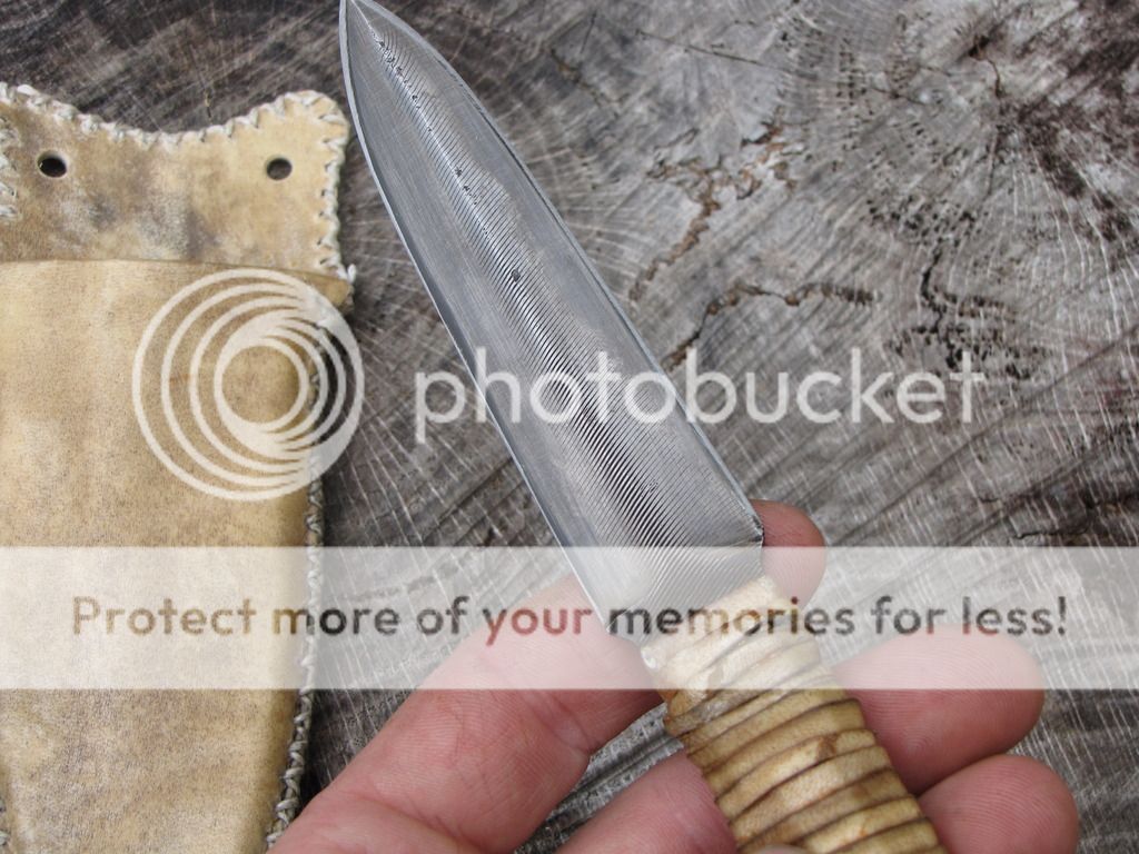 Here is a Primitive Dagger forged from an old Nicholas file. The blade is 4". It has been etched. The handle is 4" and is wrapped with deer rawhide that I made myself. There is vegetable tanned leather under the rawhide to give the handle some contour. The sheath is rawhide from the same deer with a vegetable tanned insert, lined with pillow ticking. Can be used for neck knife, patch knife, ect.