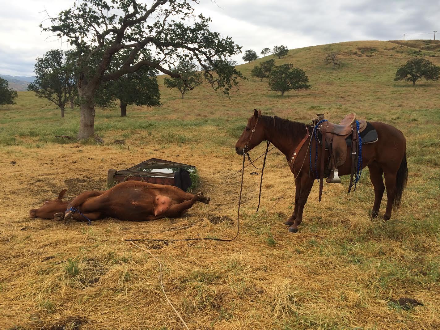 This pic was from my son riding heifers for a large local ranch last spring. So what that means is these are first calf heifers that are about to calve. This particular batch of heifers (about 200 of them) were having aa lot of problems. About every 3rd one needed assistance. So every 2 hours for about 2 months he would ride through this pasture checking the heifers. if one was having trouble he would rope it, throw a trip, lay it down, tie the front feet, have a GOOD horse hold the back and then you are probably shoulder deep seeing what the problem is. If its gonna be an extended period of time you'd probably tie the back feet too, usually to the front feet. All the blue ropes hanging on the saddle are extra tie ropes. This is big boy cowboy stuff so a guy needs to be handy and mounted cause you are doing this by yourself for the most part. Ya can see the Buddy (the horse) knows his job well and is using his weight to keep the heifers hind feet off the ground.