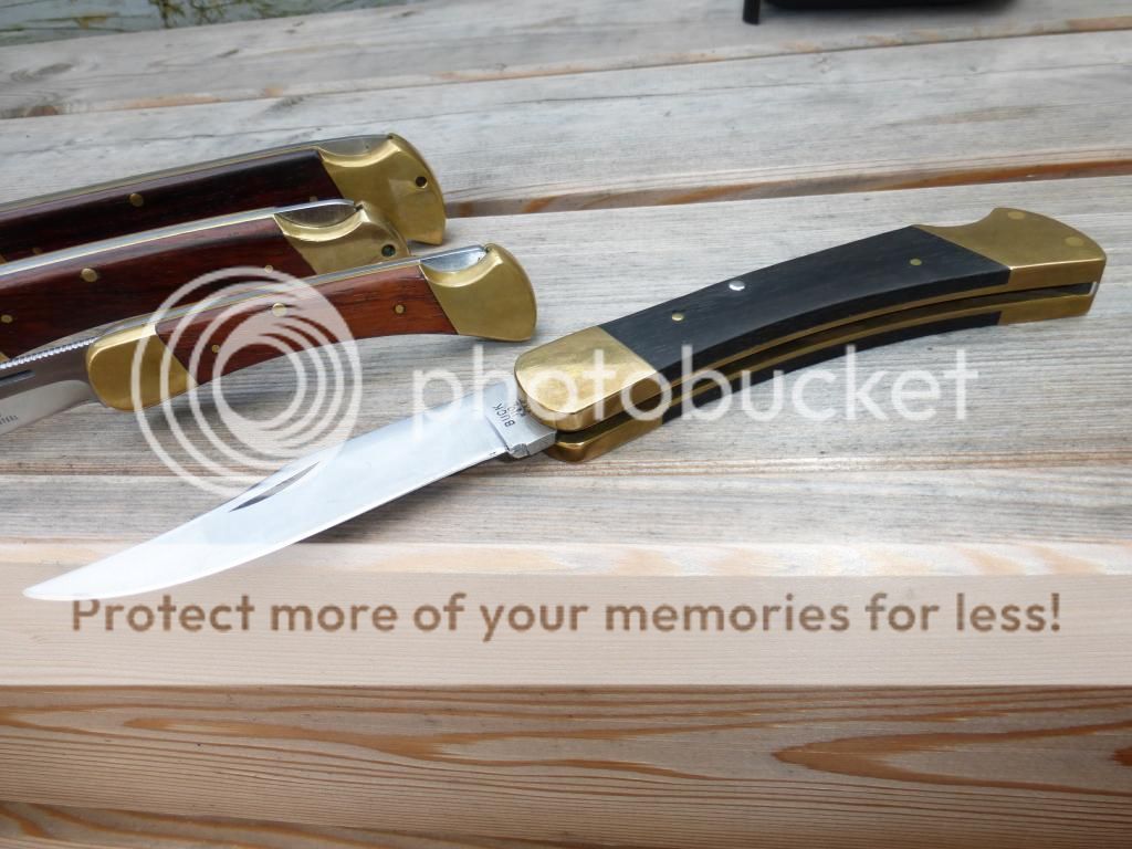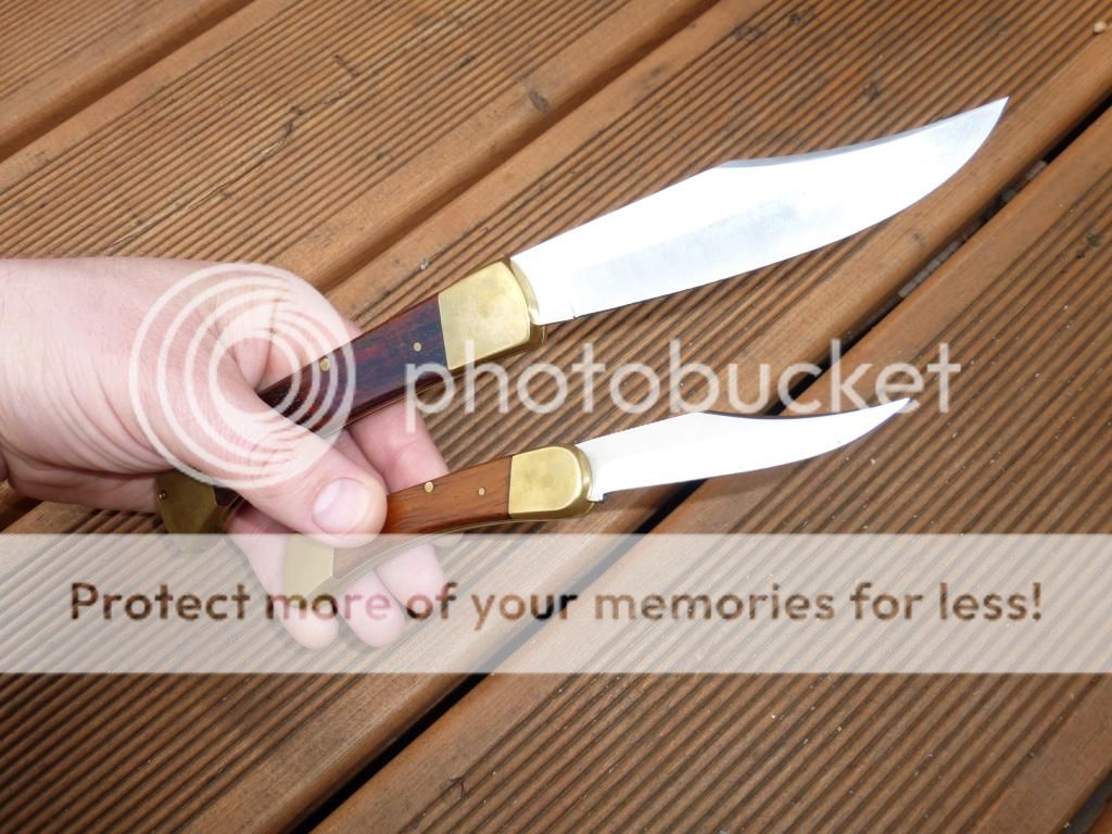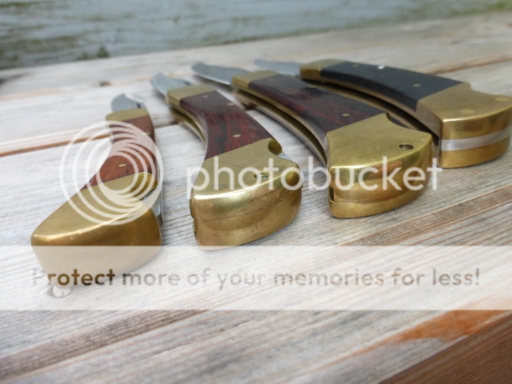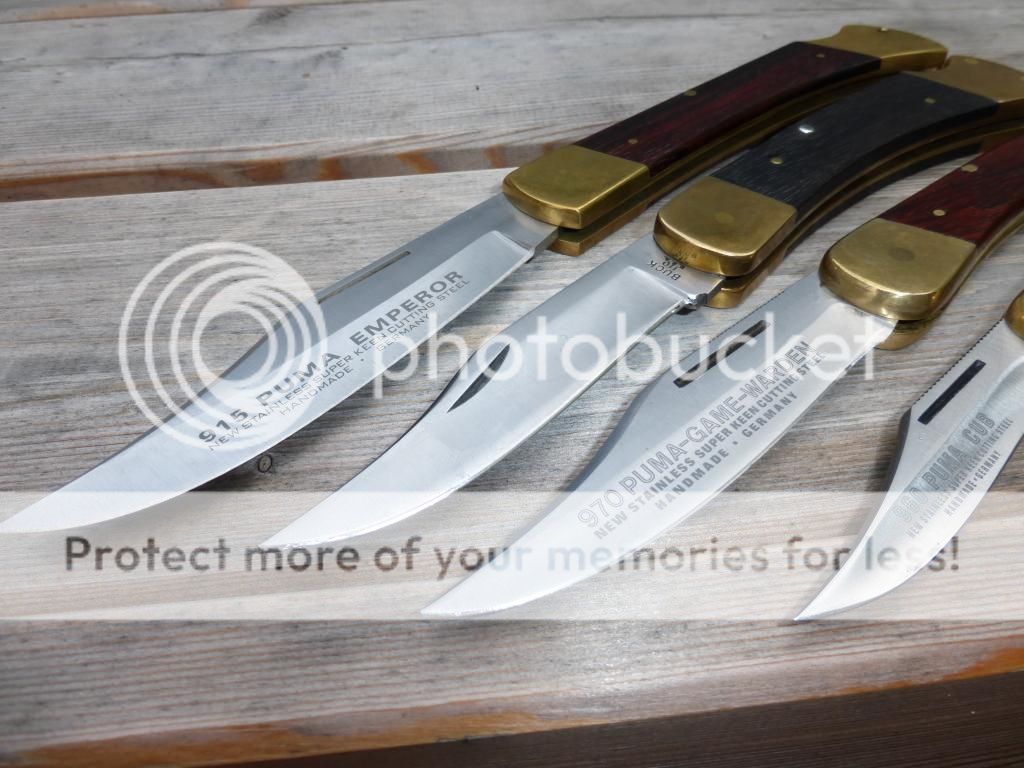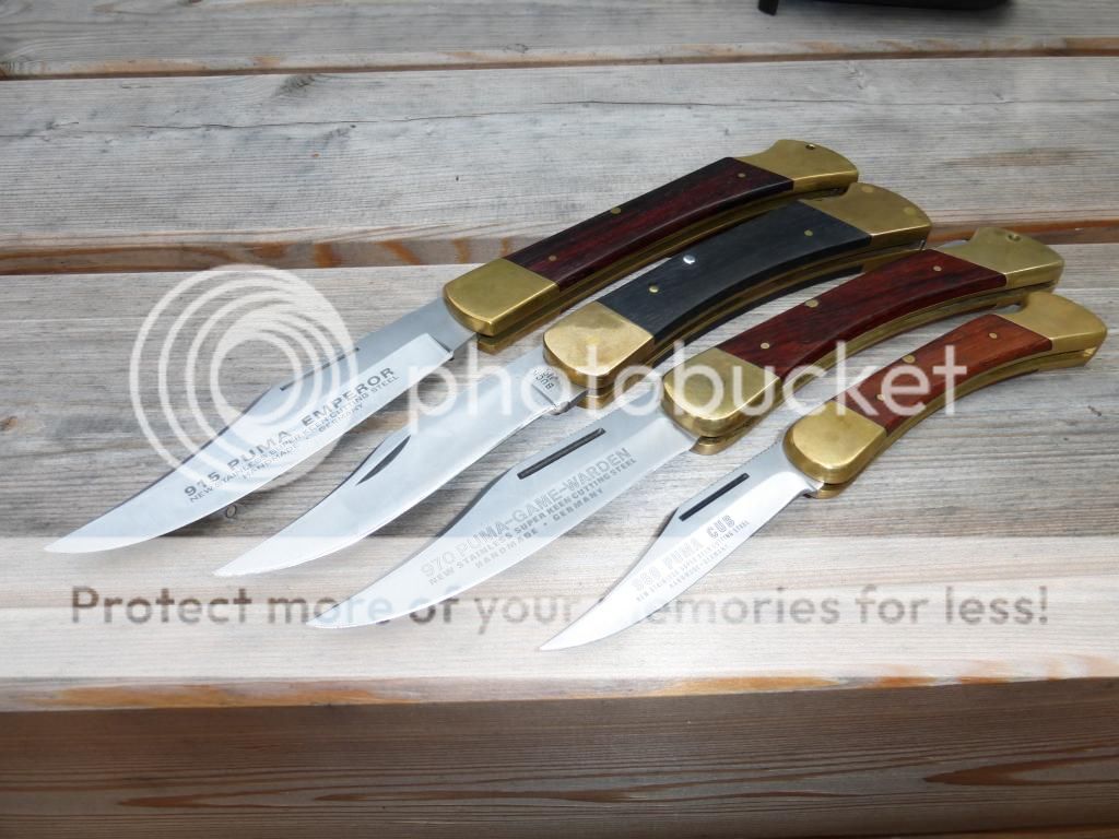 thought it would be nice to show off any Buck 110 clones people might have. I have been accumulating these Pumas recently: three puma lockbacks, the big one, Emperor from '81, the tiny cub from '74 and the Game Warden from '71, The photos show them posing with an early '70's Buck 110, I thought it would be good to have a comparison of the original brass boat anchor + pocket knife with these copies. I find it interesting that each different size knife has an obviously different blade shape, and thickness. The game warden has the same convex towards the edge as the Buck 110, but is on the whole a lot thinner, I could put a good thin slicing primary edge on this, the other knives do not.