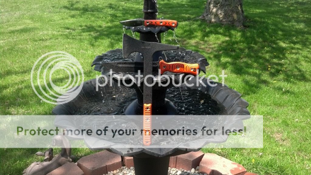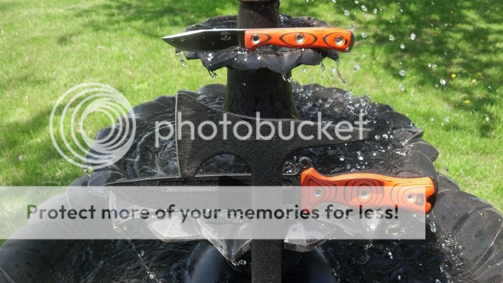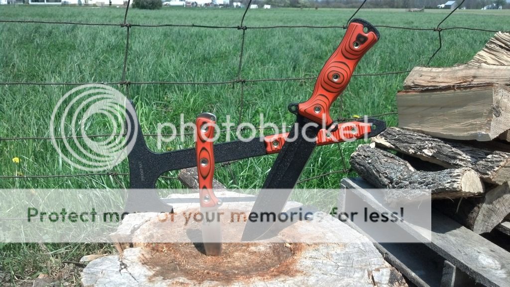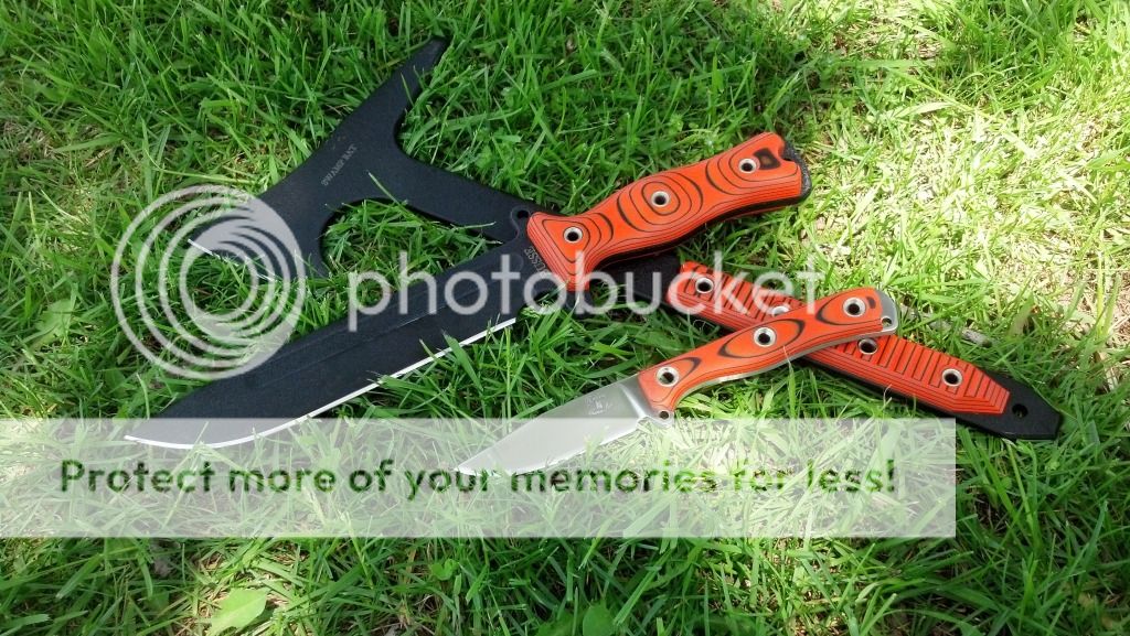 I used funds from a competition finish TGLB user I had to help fund a new TGLB with orange/black handshaped G10 scales, and also sent in an AMS I had to the custom shop for work. I got it switched from a double cut finish with black micarta to a satin finish, orange/black hand shaped G10 scales, a thinned out convex edge, and also got a swedge ground on it. I just recently recieved a KDSH from the Swamp Rat custom shop and started putting it to use. The AMS sees regular carry and kitchen use, and will be also be used on fowl I raise and for hunting. The TGLB and KDSH have been used a little on firewood and for cleaning up brush around the farm. Enough talking though, here are a couple pictures. I would love to see some other pumpkin handled Bussekin as well.
