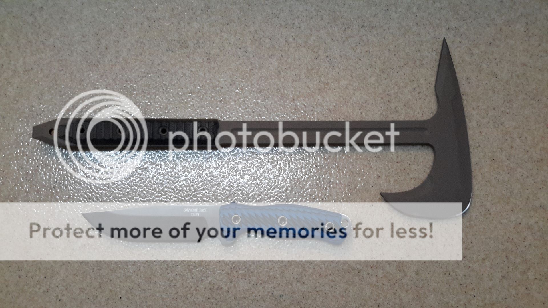 The first is a Rattlehawk. Sage coating with black canvas micarta slabs. A great way to take that pesky neighbors spruce tree down to use for next years Christmas tree!! It has never been used or sharpened. It comes with tactical cardboard sheathing (white mostly). $350 USD net to me for "next day" priority shipping (get that tree this year!!) or $330 USD regular shipping included.