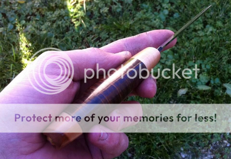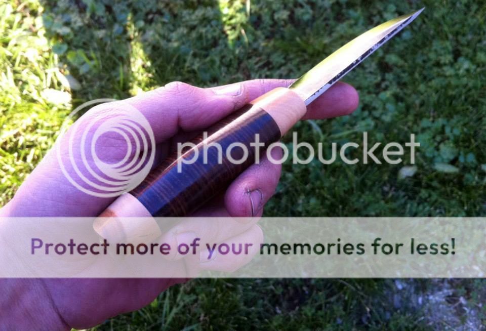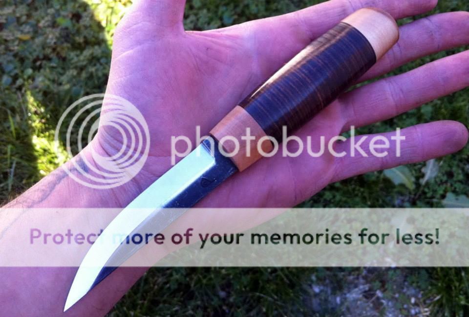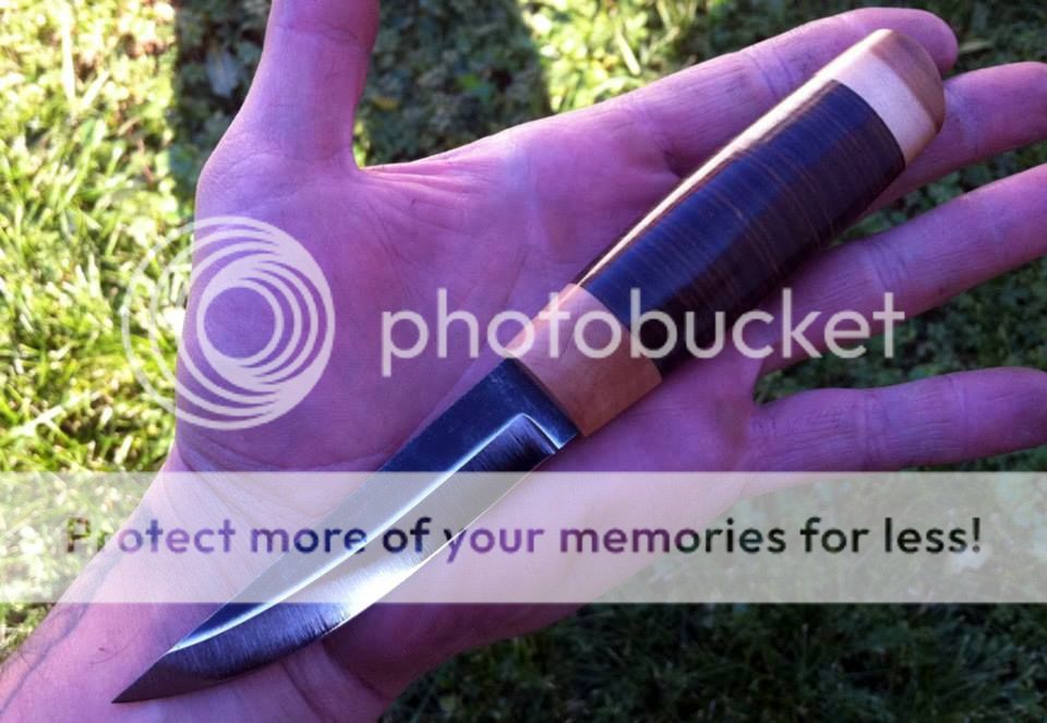Looking to sell my unused puukko made by Barbudo Knives of Croatia. Handle is stacked leather and cornel wood. Blade is saw steel with a forge finish on the spine. Handle is 4", blade is 3 5/8" and shaving sharp. Leather sheath with "brush camo" finish.