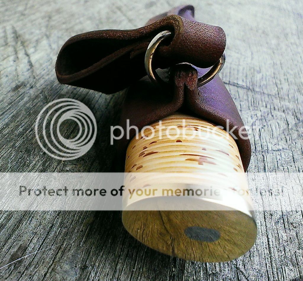 Handle is stacked birch bark and brass .