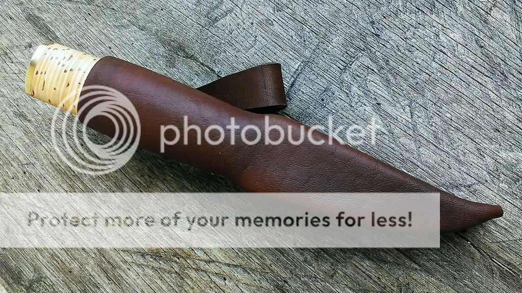Sheath is natural leather, with wooden inlay and back seam, impregnated with beeswax.