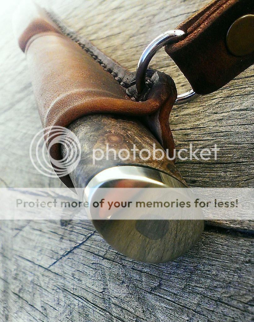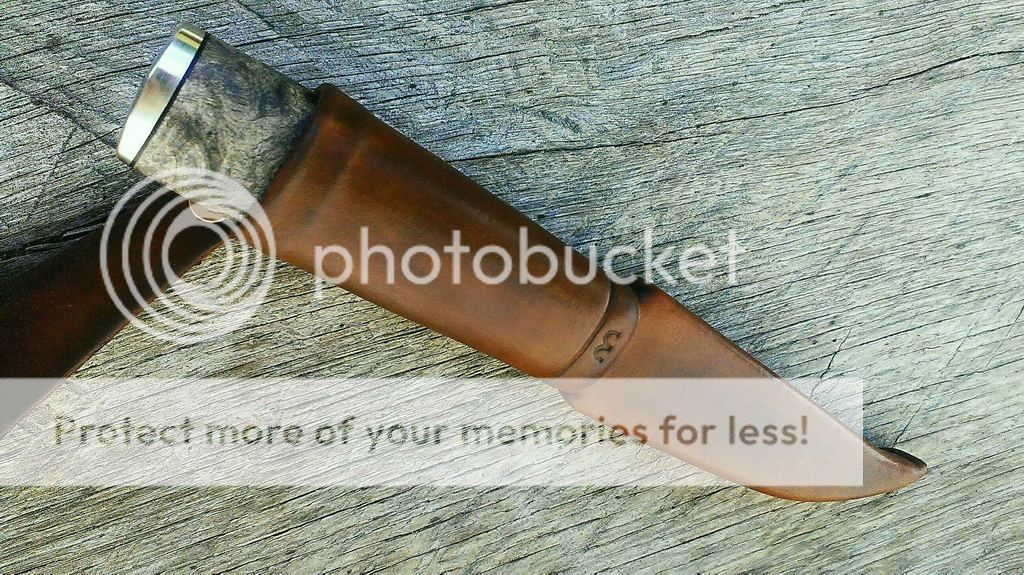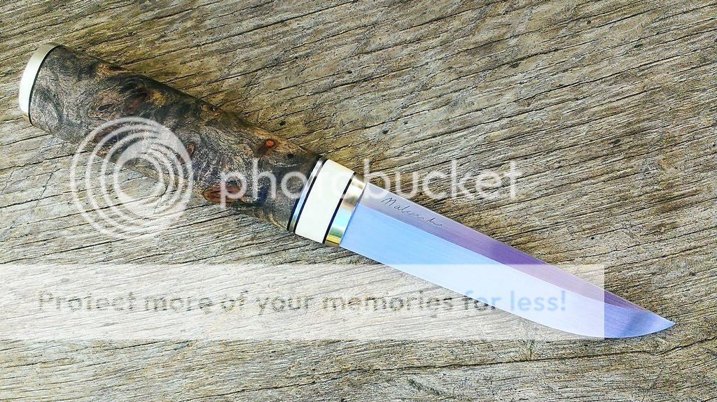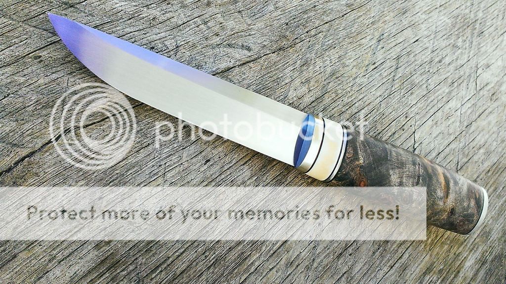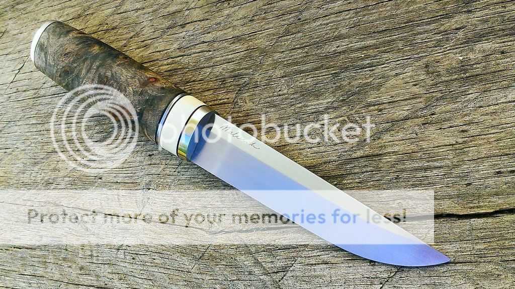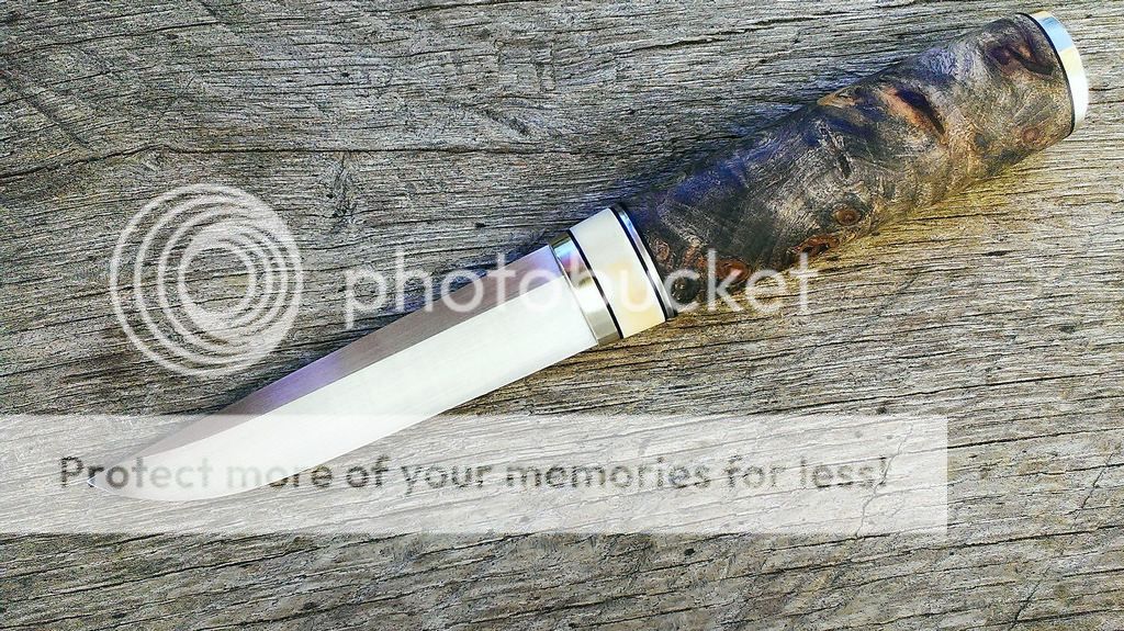 Handle ( 4.5") is stabilized buckeye,reindeer antler,nickel silver and black vulcanfiber.