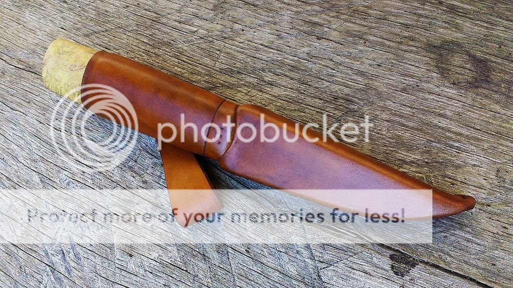 Sheath is coloured leather, with wooden inlay and back seam, impregnated with beeswax.