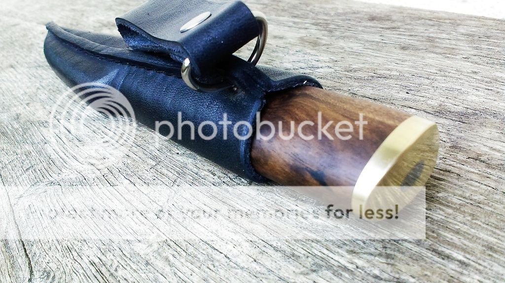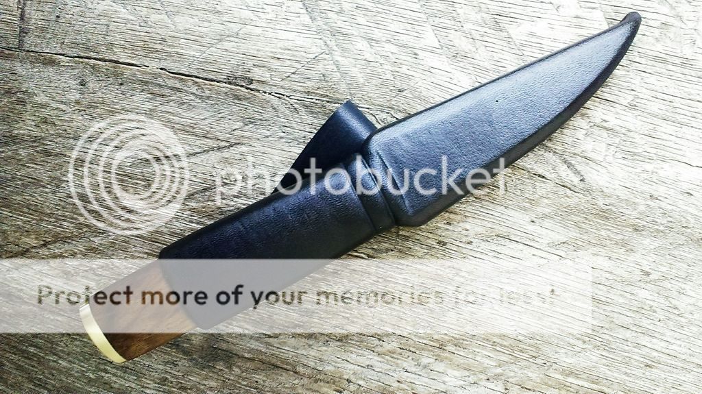 Sheath is black coloured leather, with wooden inlay and back seam.