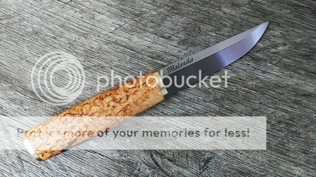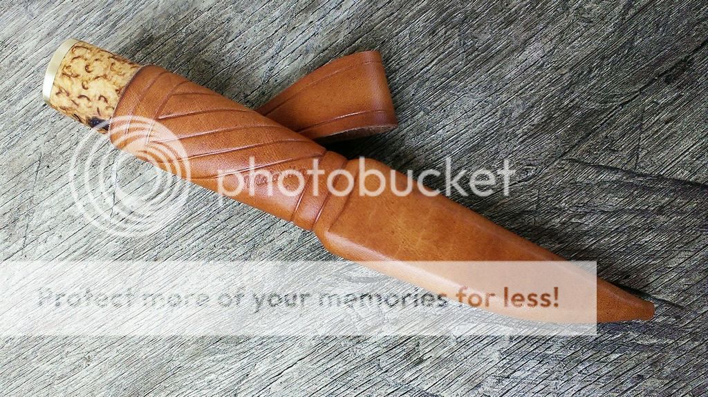 Sheath is natural leather leather, with wooden inlay and back seam.