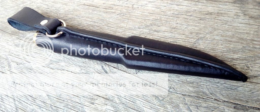 Sheath is black coloured leather, with wooden inlay and back seam.