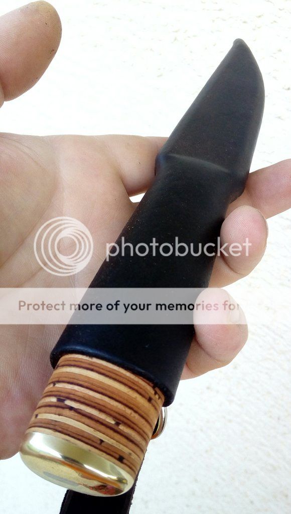 Sheath is dark brown coloured leather, with wooden inlay and back seam.