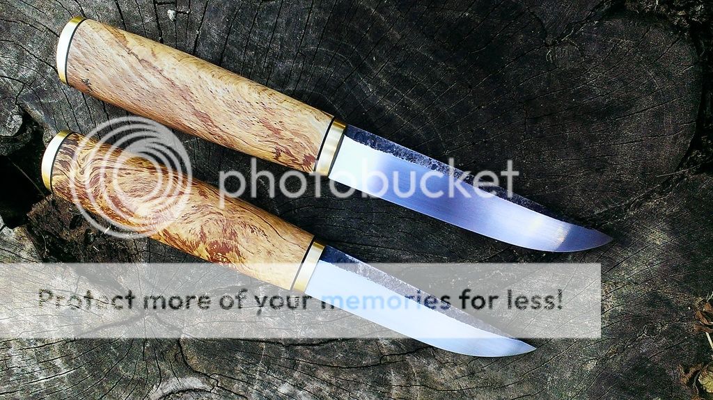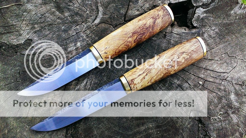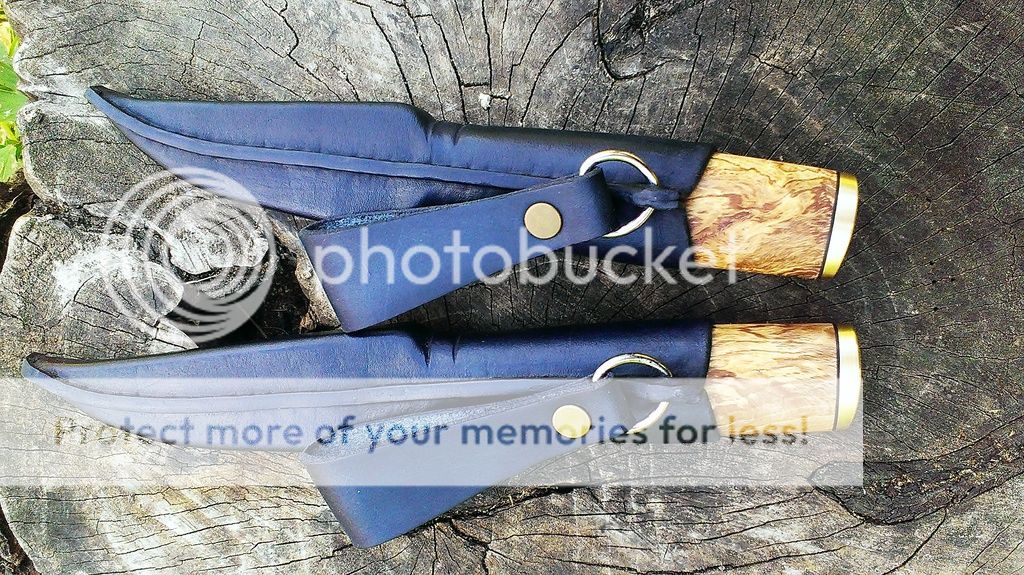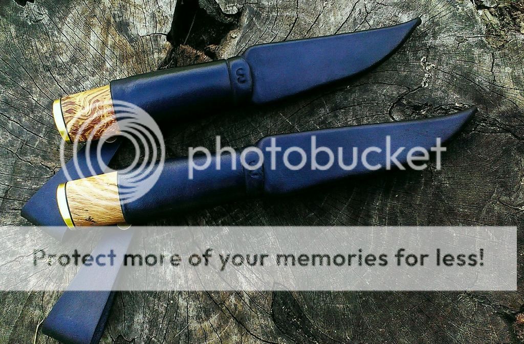 Sheaths are coloured leather, with wooden inlay and back seam, impregnated with beeswax.