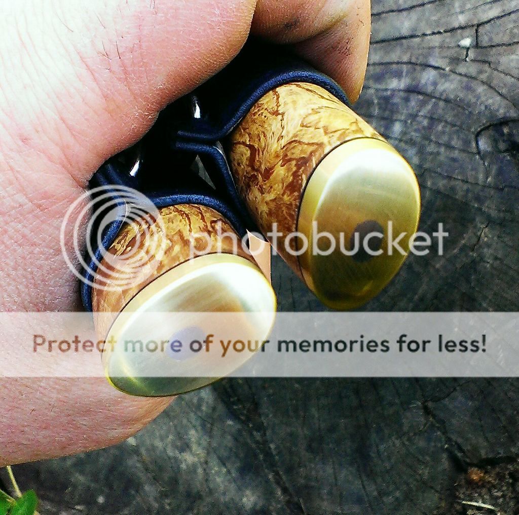 handles are nice stabilized spalted beech ,very hard and durable, black vulcanfiber and brass.