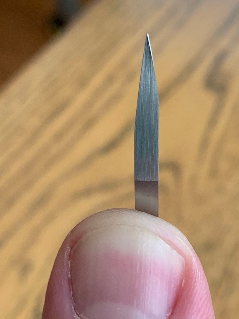 I can clearly see that one side of the grind is a different angle than the other. If I were to correct this on the belt sander I would have to completely reproduce the blade and remove more material than I’m comfortable with.