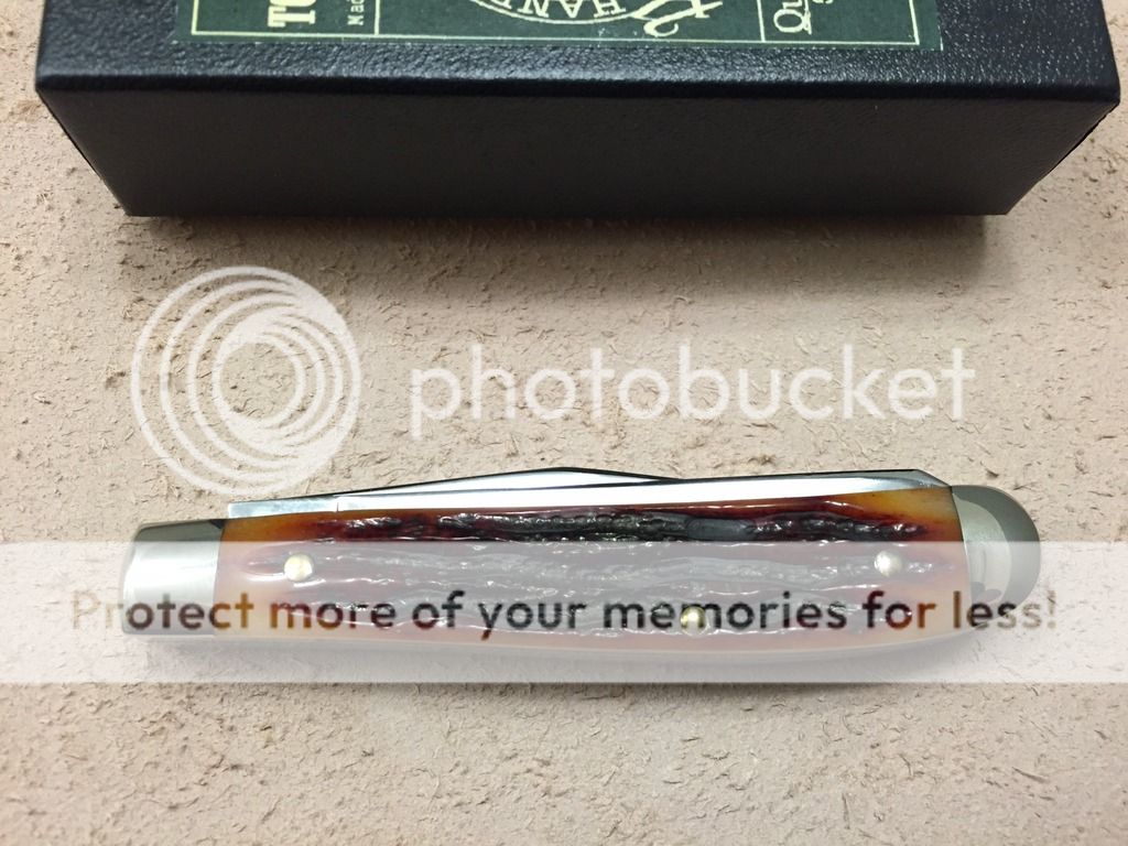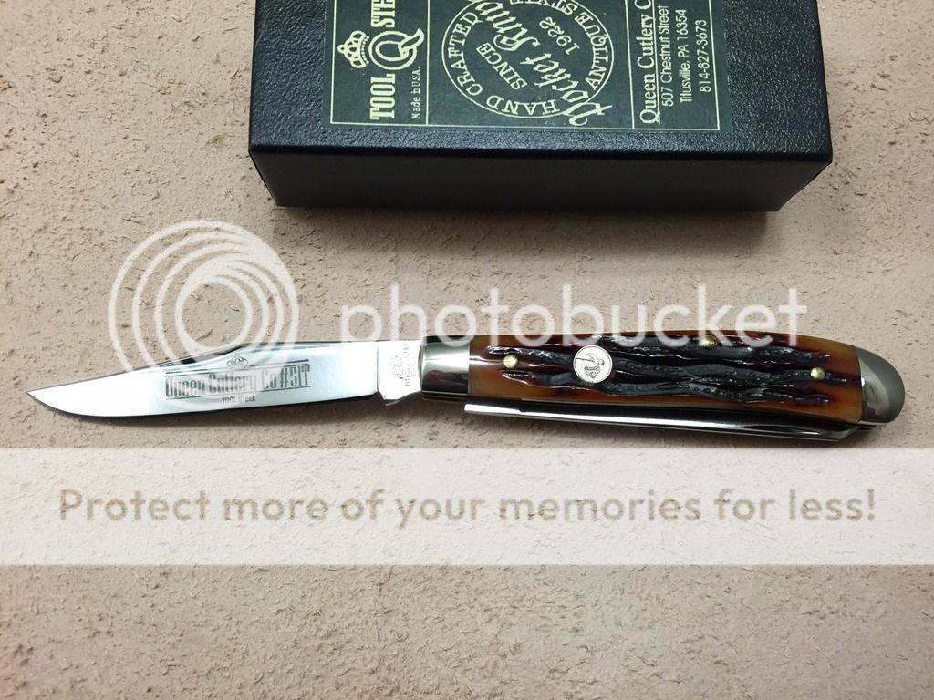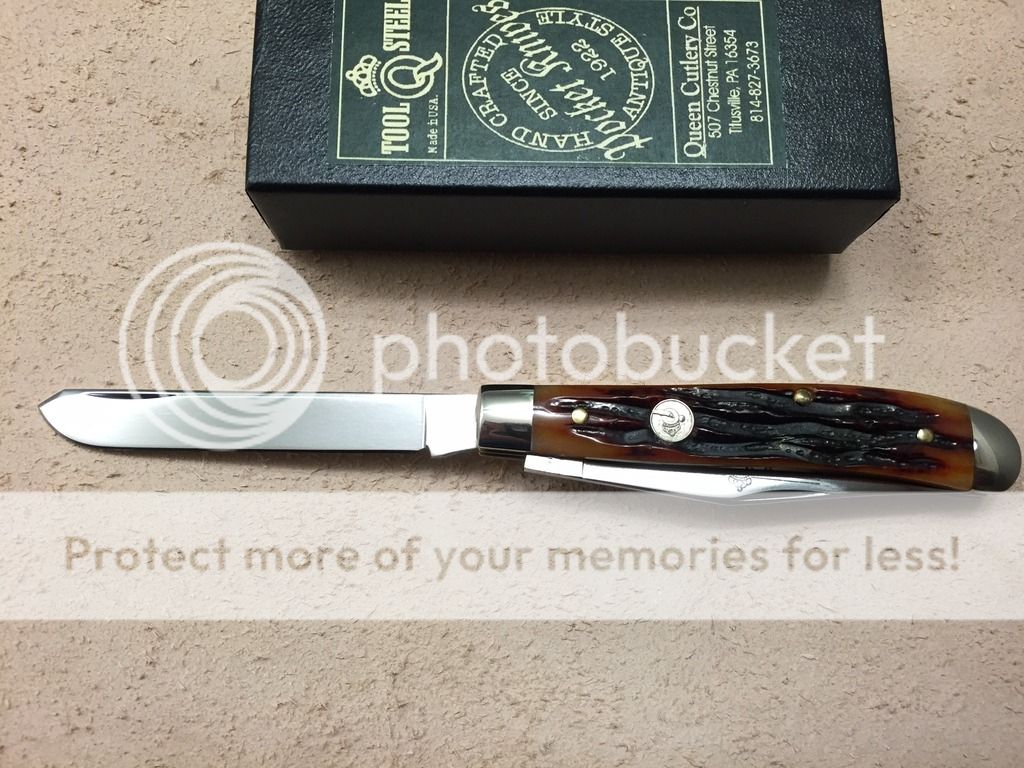 First up is a Queen small trapper in amber carved stag bone. This knife is unused. Overall, fit and finish is good and average for what I have seen. Both blades are slightly off center, and the factory edge is useable but not as sharp as it could be. Other than that, the scales are evenly matched and make for a very nice looking knife. The original box is included.