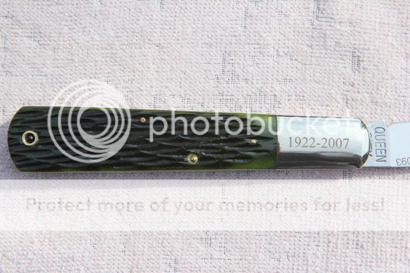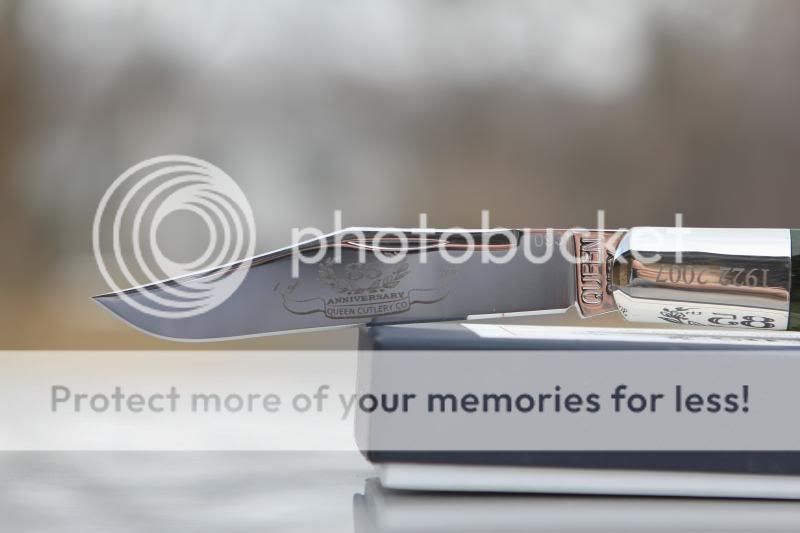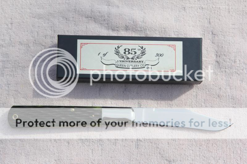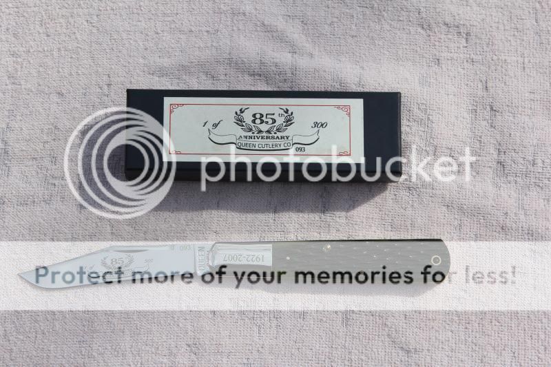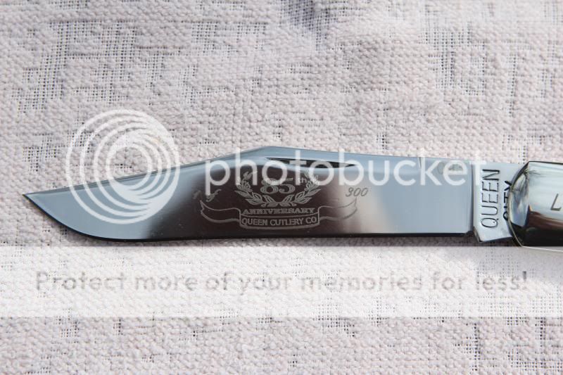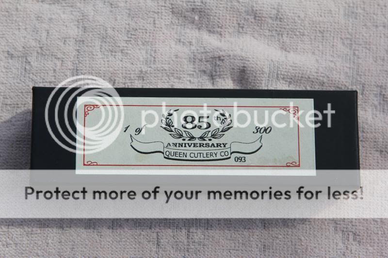 Blade laser etched "85th Anniversary", "Queen Cutlery Company", and "93 of 300"