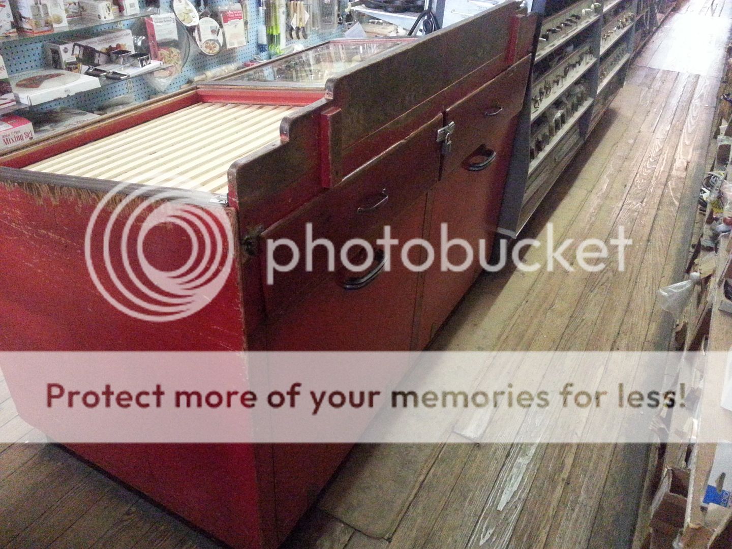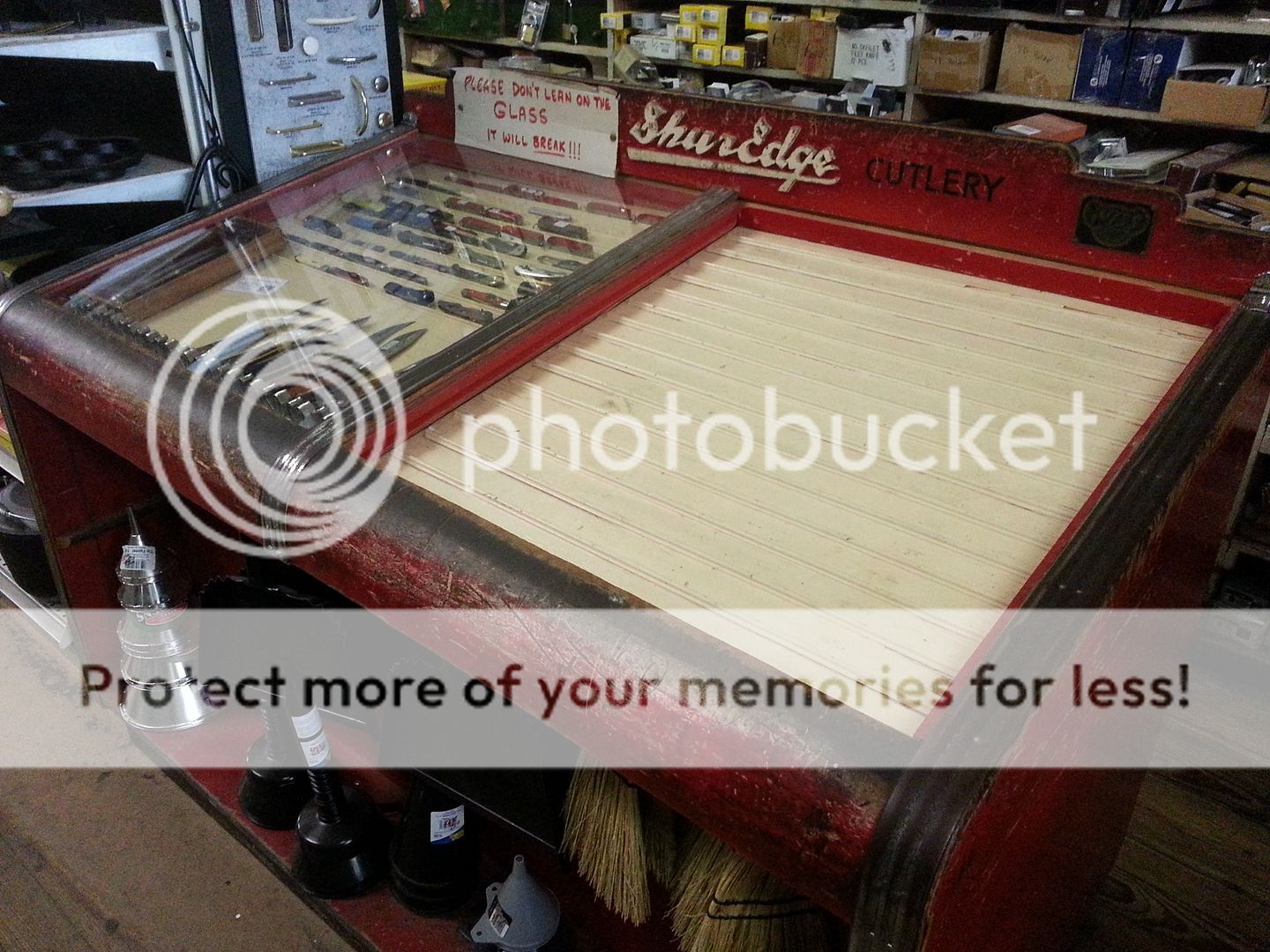 In the middle of the store sits this old, worn shuredge display case! Now, this is patina!