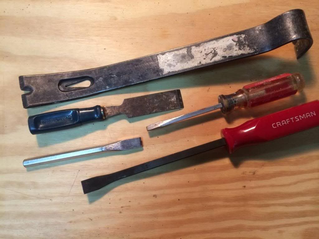 I've been buying stainless steel knives for a long time, then I started reading here a few years ago about carbon steels and their increased toughness for bushcraft and other things. I started remembering how I had really beat hard on various tools of my own, in particular an old pry bar and an old wood chisel, so it made sense that the right steel would bring some of this performance to a knife. I was in my garage today cleaning up some tools after a plumbing adventure and took this photo. Of course everybody has beat on chisels, and back when I was working as a mechanic we beat on screwdrivers a lot too. I've seen warnings to wear eye protection when using striking tools, and I've seen bearing races and such shatter when being beat on with chisels. And strangely as hard as chisels might be I've seen lots of them with mushrooms on the end where they have continually been hit with hammers, so this might be hard steel but also is pretty tough/ductile.