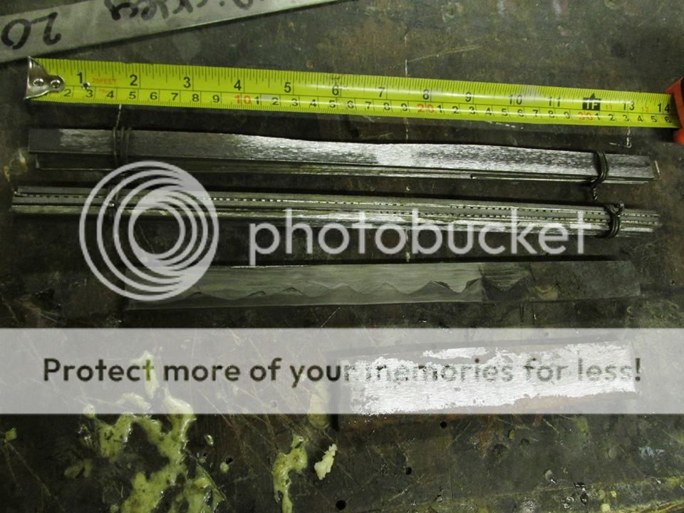 Because I do my pattern welding by hand I often get creative about how I assemble billets to make things easier on myself. In this case making 1/2 wide x 3/4 inch thick, x 13 inch long billets. This next photo shows what will become the spine (five bar composite) and the edge billet.