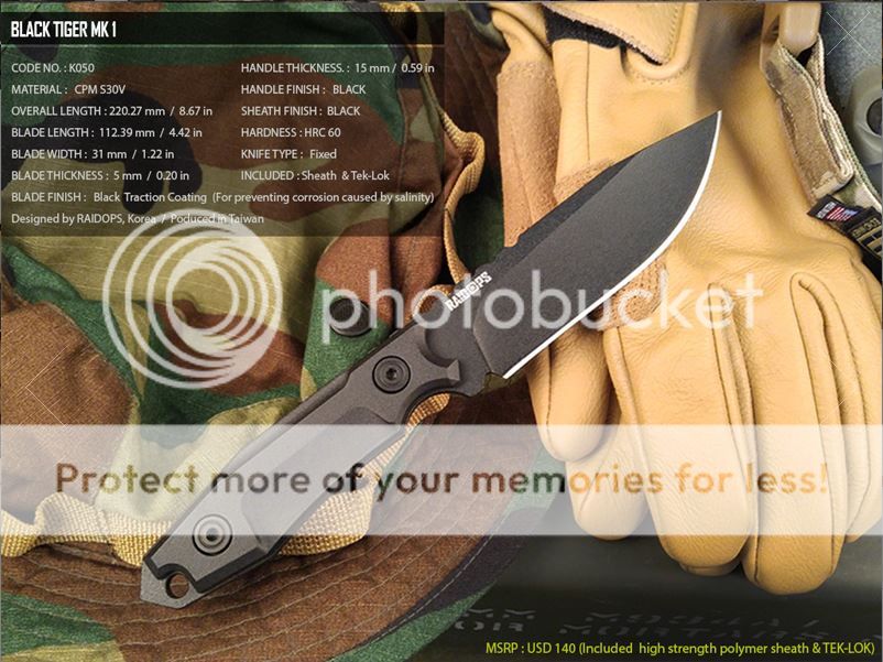 Brand new in box. Picked this up from tacticalelements.com. Raidops is a tactical gear maker in Korea. Black coated fixed blade in S30V steel. Black high strength polymer sheath with Tek-Lok. See pics below. The last one is from raidops.com and shows the specs of the knife. The first three are of the actual knife in my possession. $120 NET Shipped via Paypal