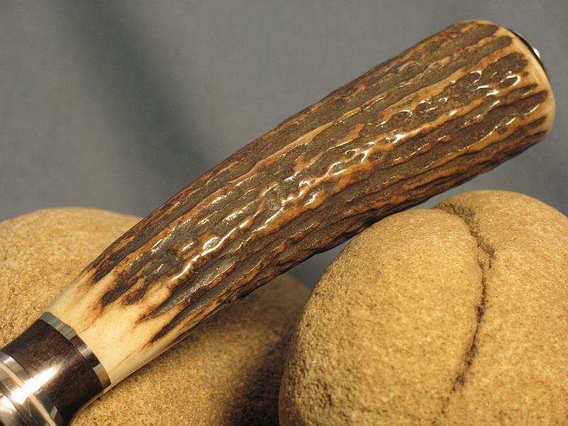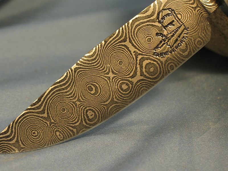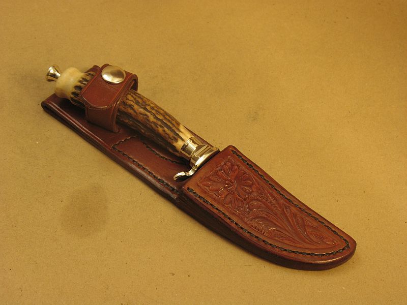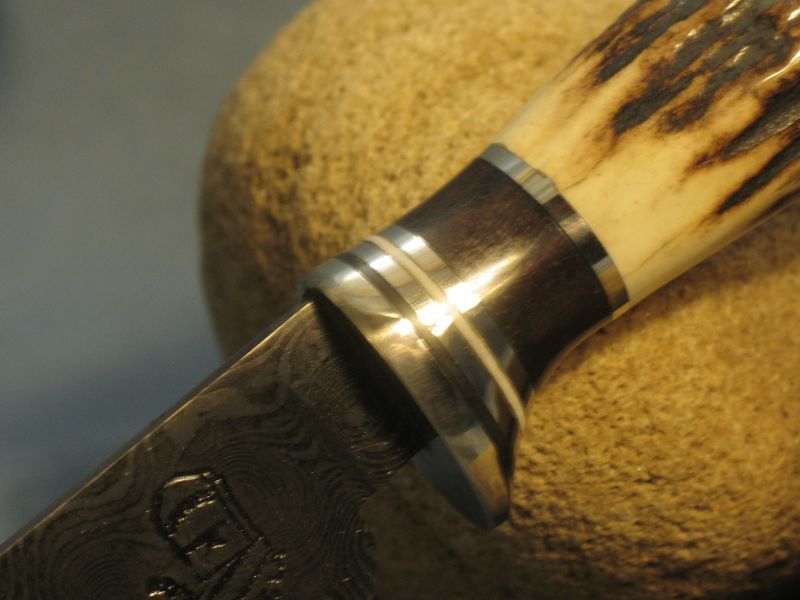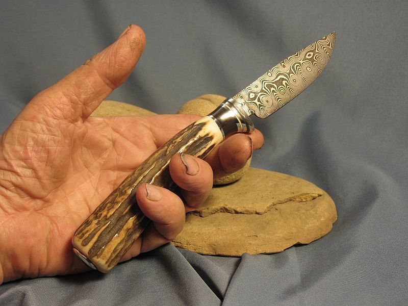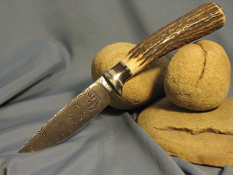 Hello folks. This one has a different style of guard than I usually do. Black spacer is African black wood with Sambar stag from India. Good for the right or left hand and very comfortable. Hope you like it and here are the specs. Fittings are nickel silver. Damascus is 1084 and 15n20 in a raindrop pattern that I made. The blade has a subtle drop and measures 3 7/8 inches and overall is 8 7/8 inches. Bottom picture is a example of sheath I can have made. Takes about a week as I don't make them and He hand carves the design. Sheath is 40.00 extra.