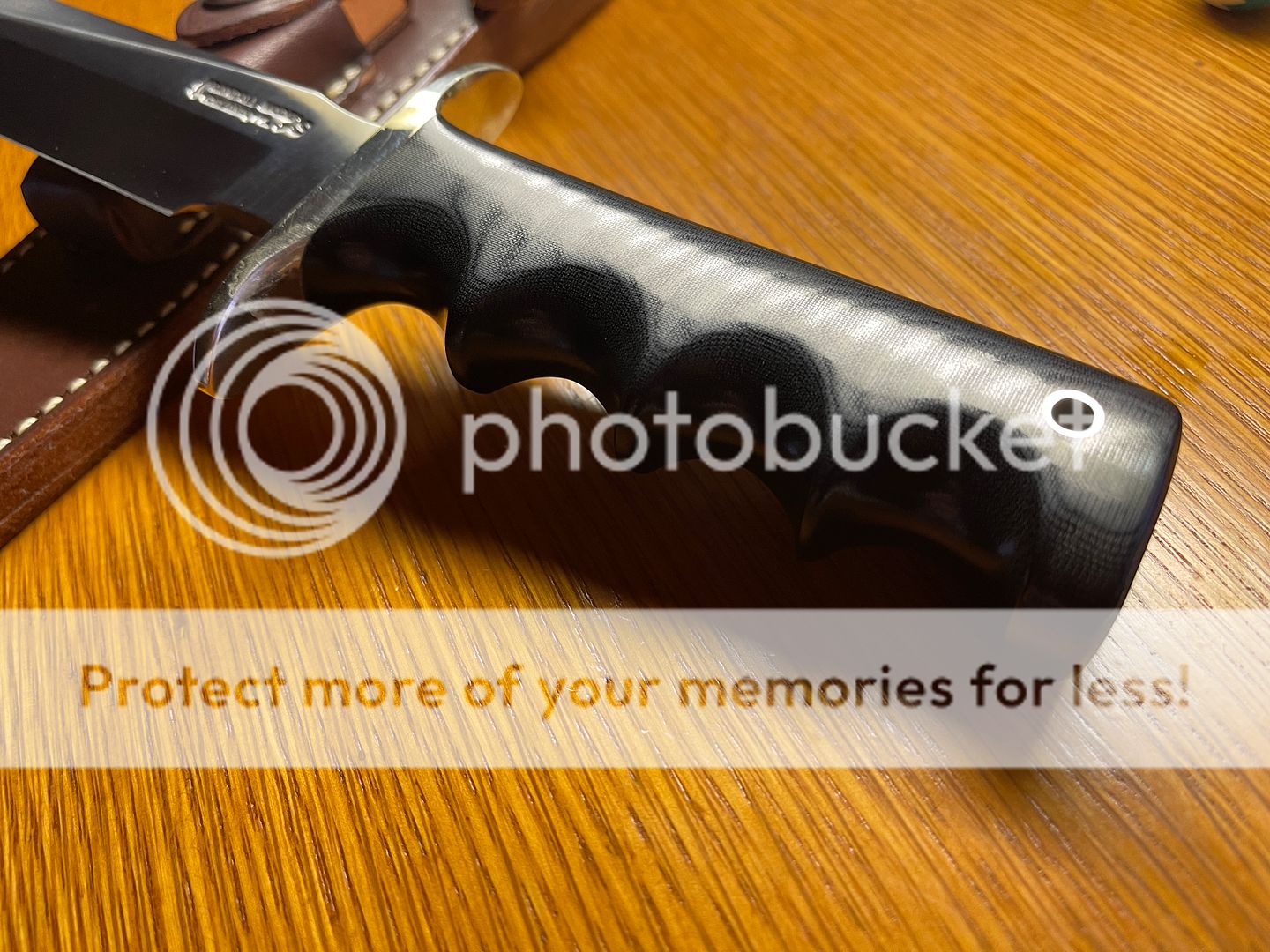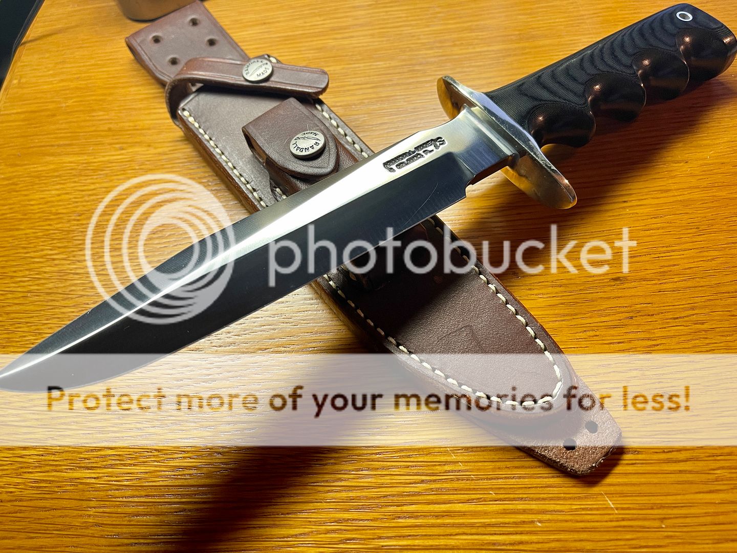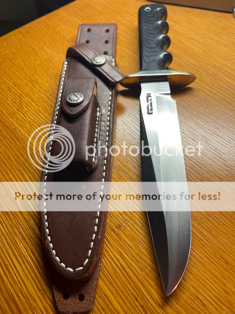 This Model 16 from Randall Made Knives features a satin finish clip point blade with sharpened top edge, 0.218" blade stock and 1.216" blade depth, full tang construction. The handle is comprised of a brass double guard and black linen micarta finger grip handle. Brass lanyard tube. Includes brown leather sheath with stone pouch. Excellent condition.
