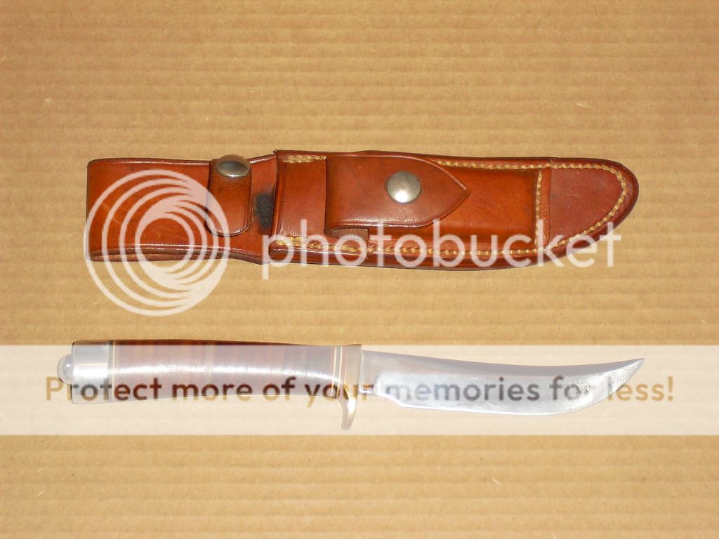 Approx. 4.5" carbon steel blade, stacked leather handle, Duralumin butt cap, brass guard, leather sheath with stone included. Sheath has "7" & "5" stamped on the back.) Carried & used, but still in great condition overall. I got this in a trade last year, and I haven't been able to use it outdoors at all. It's opened a couple of letters, that's about it. Could use a good sharpening. PM or email with questions.