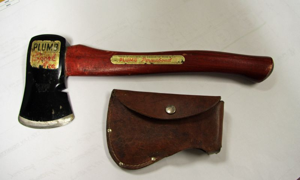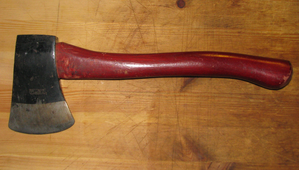 Plumbs are typically stamped. Do you suppose there is a stamp under that decal because otherwise first time out this hatchet would have become a 'no name' implement. Even more so when the wood was re-newed.