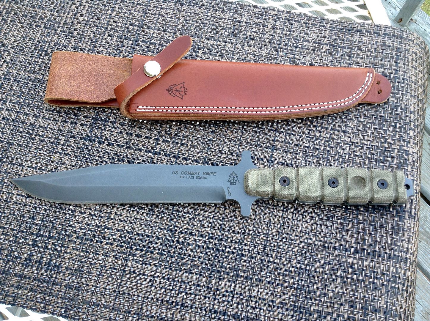Here I have a Tops US Combat Knife. This is a rare model because it has no serrations, has the gray riverwash finish, tan canvas micarta scales and the leather sheath. This one came from the actual blade designer as these options are not available from Tops for anyone else. This one is new, unused. $195 shipped for this beautiful, made in the USA, knife.
