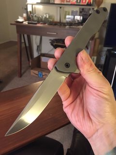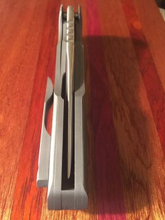 This is one of his first models. It is super smooth, fires open, and falls shut. Framelock with Ti scales and satin finish on the blade.