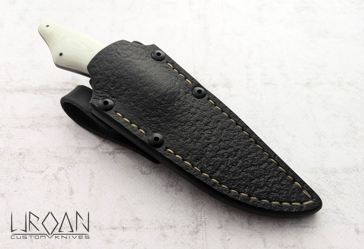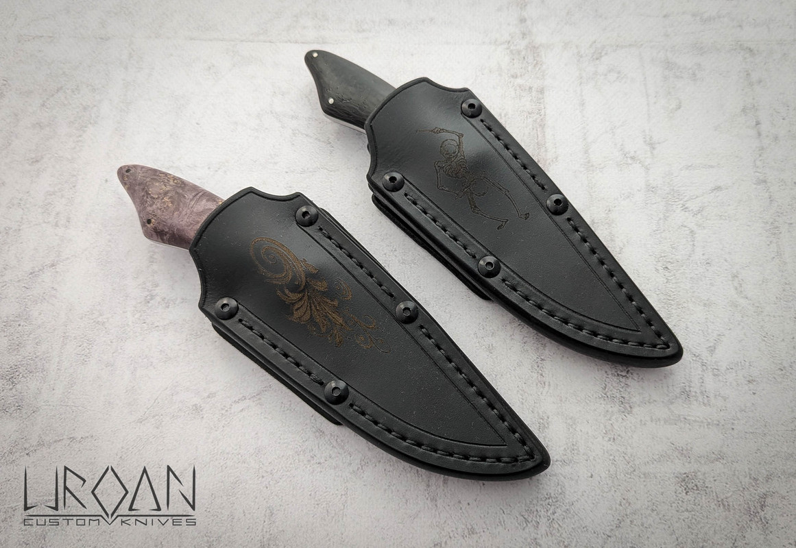 Hand stitched leather sheath with laser engraving. Can be carry both vertically and horizontally on both sides of the body.