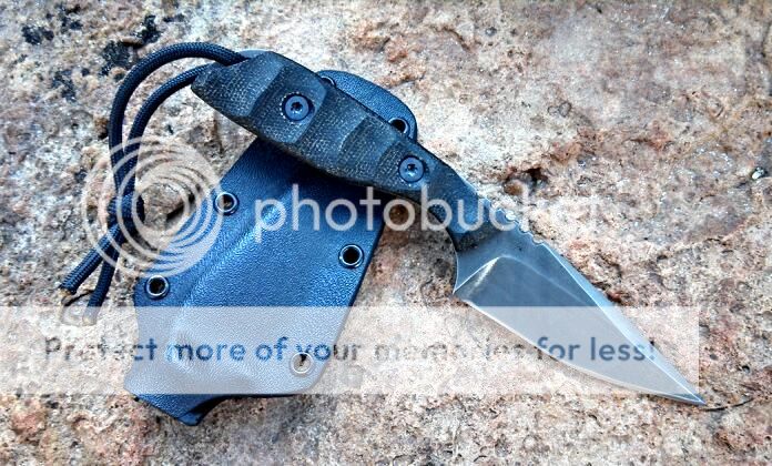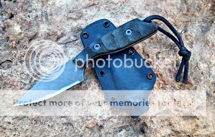 This is the first Raze in 3V. 3/16" stock. Around 7" total length. Right hand chisel grind with a stonewashed finish. Black canvas micarta handles. Comes with a kydex sheath and large teklock.