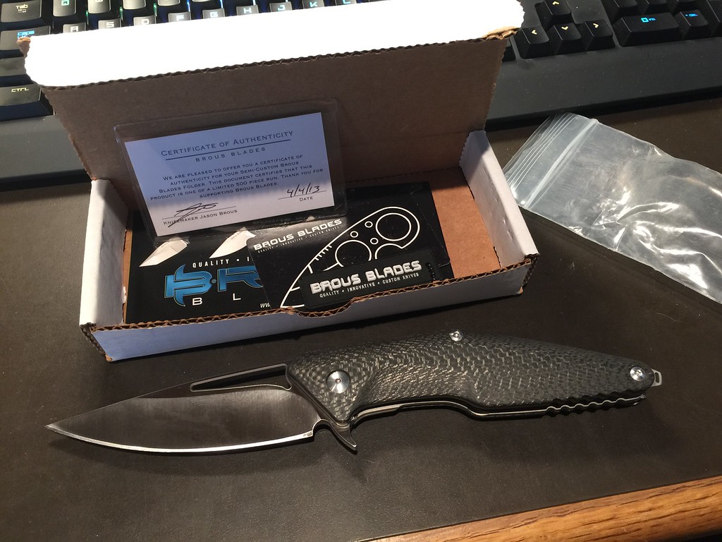 217/500. Just not my thing, just way too huge of a beast. Flips like a dream, super smooth, nice CF weave. Satin finish isn't the best, it looks like it has scuffs and scratches but that is just how Brous' satin finishes look. Carried once or twice, nothing cut that I can remember. Comes with box and all pack-ins (COA card, business card, flyer, keychain, baggie, sticker). Asking $350.