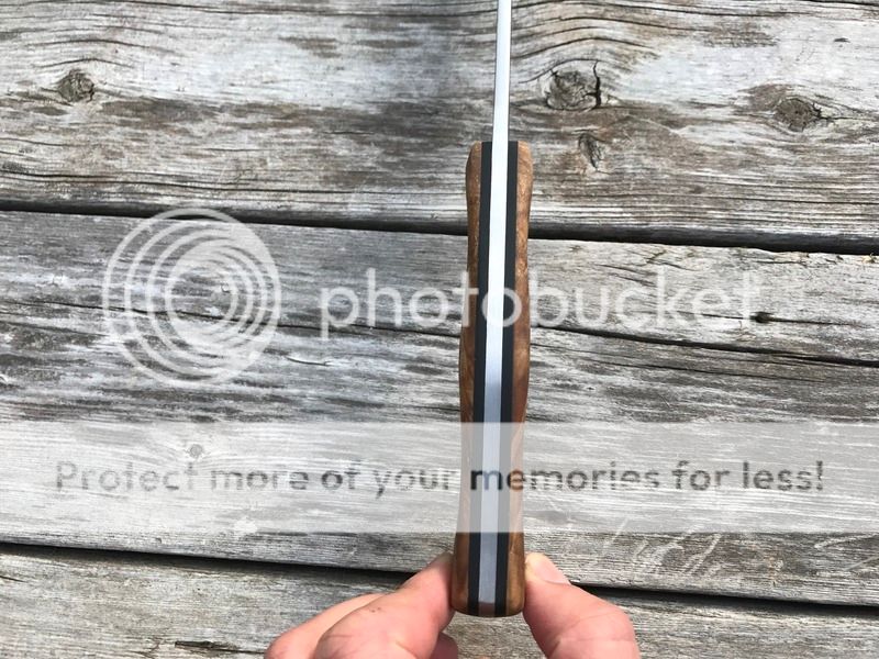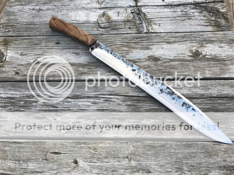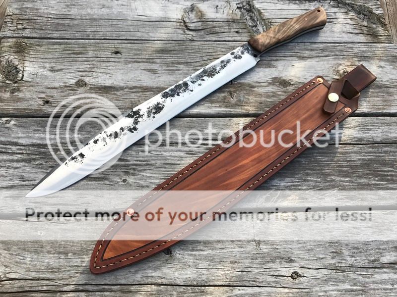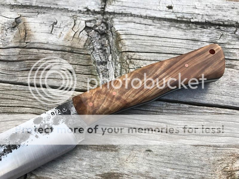 Up for sale is a recurve chopper. Blade is 15 1/4" forged from 3/16" 1084. Handle is 5 1/8" long WSSI stabilized birch burl with 1/8" black micarta liners. Handle is shaped with palm swell. Copper pins and thong tube. Sheath is 8/9oz vegi tanned leather. Price is $385 shipped CONUS and Canada - PayPal preferred. Thanks for looking!