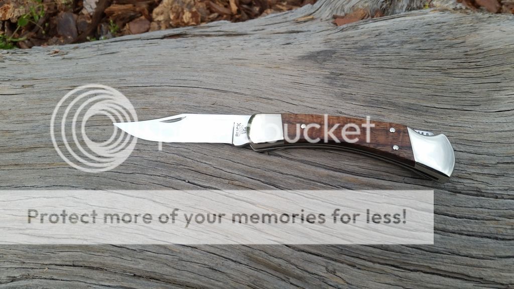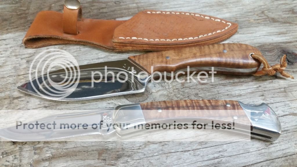 Beautiful Koa adorns this Ns 110. The grain has a holographic effect when tilted in the light. Scales are glued and pinned with (new not reused) factory scale pins. Polished blade. Comes with vintage NOS Custom Shop holster sheath ( have clampack and knife box too) and black leather sheath. ( everything is new)