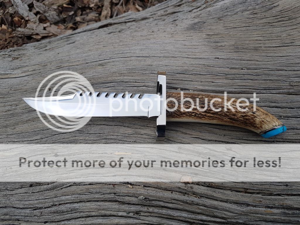 Mirror polished blade. Hand milled titanium guard. Elk stag. Titanium spacer under turquoise pommel. I'll include the original camo sheath ( not pictured ) and a used 970 (lots of nicks from insertion) dagger sheath.