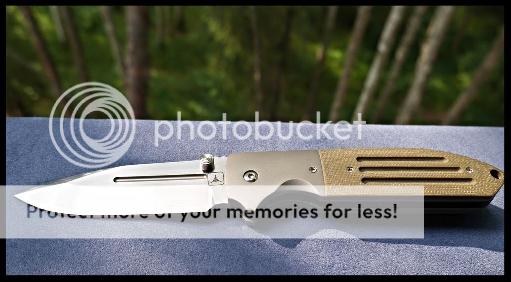 Features a drop point satin finished blade with dual thumbstuds and a notched thumbrest. The handle has bead blasted titanium bolsters, green G-10 scales, bead blast titanium liners and tip up titanium clip. Perfect lockup, detent, and blade seating.