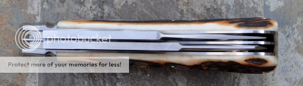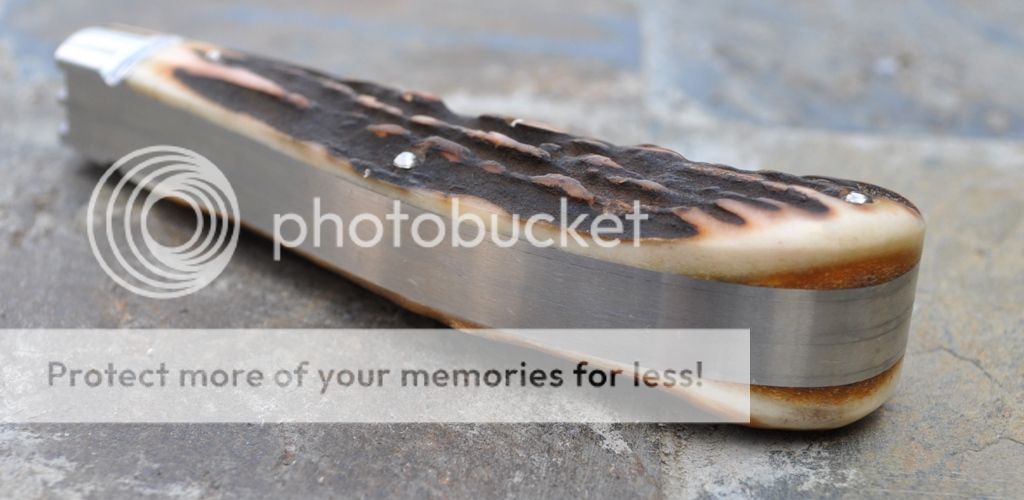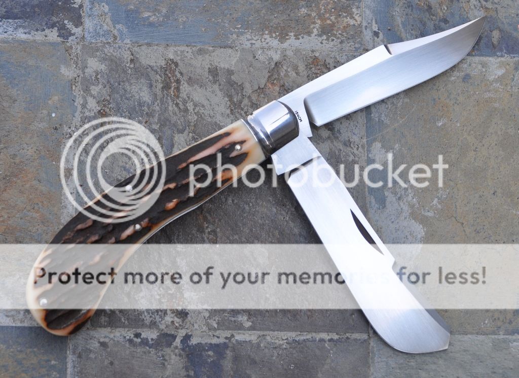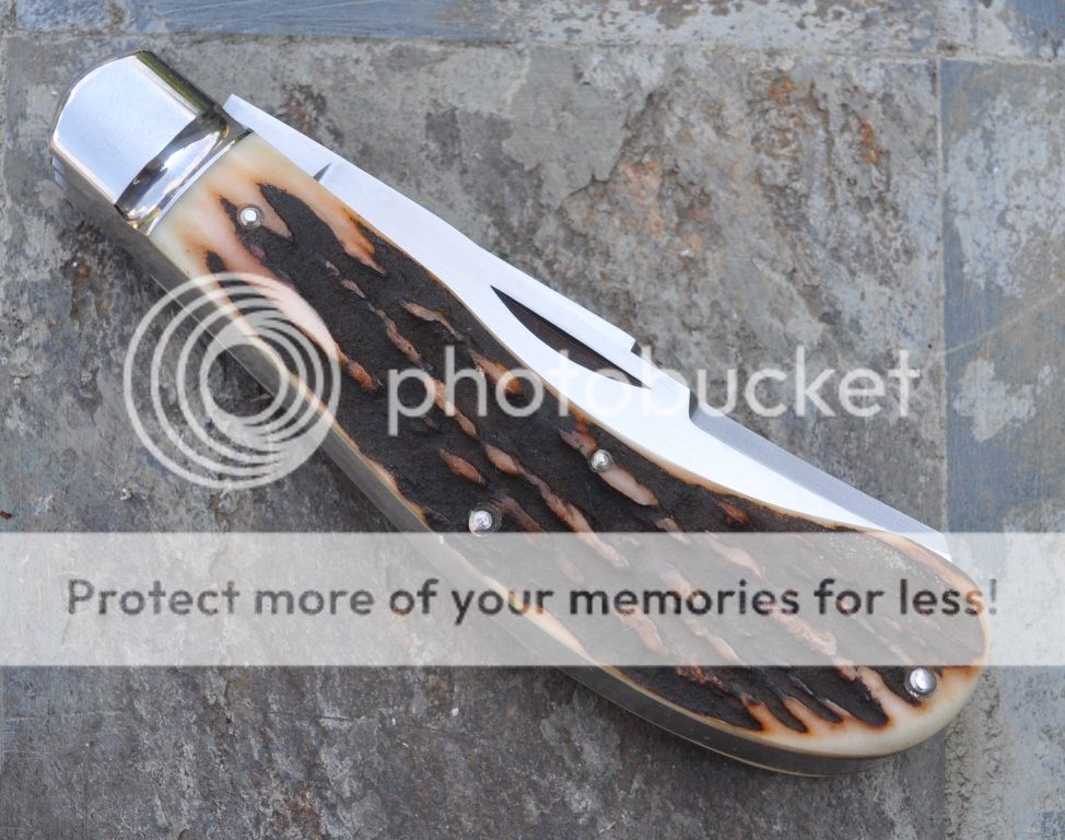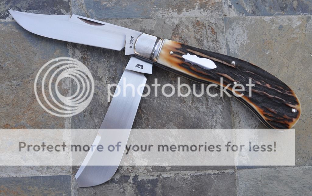 This is a new knife just completed by Reese Bose. I ordered it about three years ago. In the interim, I was able to obtain one very similar so this one needs to go to a new owner. It is a 2 Blade Medium Saddlehorn Trapper Pattern #1 with 416 SS Rat-tailed bolsters, Double bomb shield, 416ss hdw., stag scales, 3 1/4" HR , 154CM blades, 4 1/4" Closed. The stag is beautifully matched.