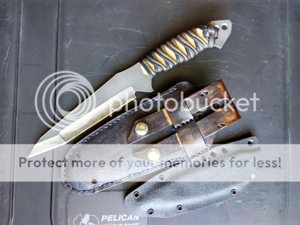 Comes with a custom leather with kydex insert as well as original kydex sheath. Great retention upon resheath.