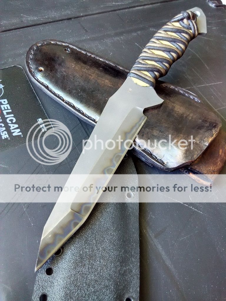 It is chisel ground on the left,flamed and heavily carbidized on the right. Scuff marks on the blade surface are from kydex.
