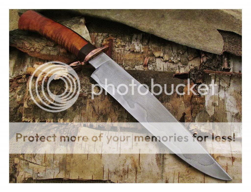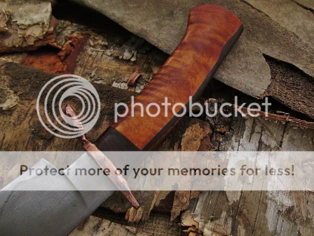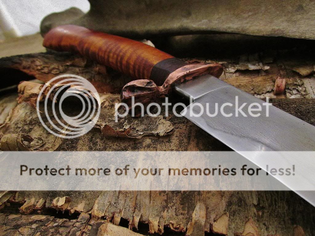 I recently finished this large fighting knife hand forged from Aldo's 1095, clay coat and quenched to achieve a hamon. The guard is antiqued copper with my own take on a clam shell guard. The handle is laminated with curly maple, walnut, and leather spacers. The sheath is made 9 oz leather, stitched with artificial sinew, and an inlay of 26 guage fold formed copper sheet that has been antiqued as well. If you have any questions feel free to PM me.