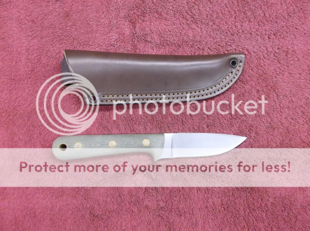 Brand new. Flat Grind, O1, Olive Micarta scales (bead blast) w/ brown factory sheath and soft case. The knife is perfect. I am selling it only because I just bought several Battlehorse knives and this is the one that really does not fit my monster mitts as well as the others. (I wear an XXL or larger glove - the handle would be fine for a person with more normal sized hands). SOLD Shipped and insured CONUS. Payment by Postal Money Order or Visa/MC (add 3%). The first "I'll take it" post gets it. Thanks for looking.