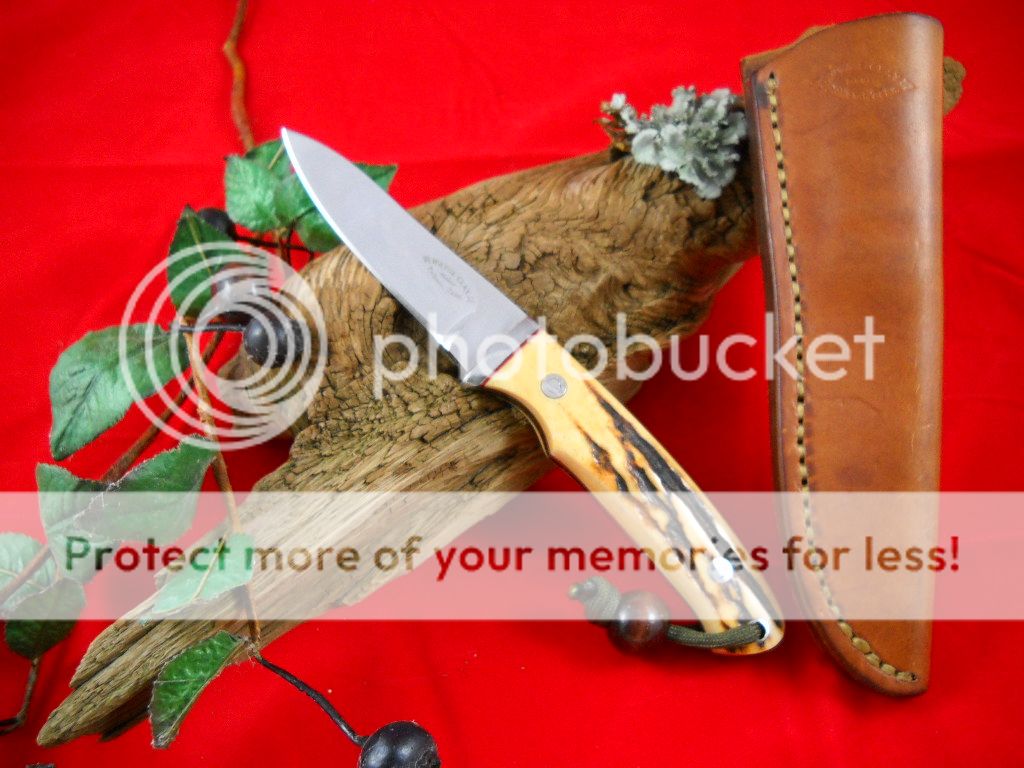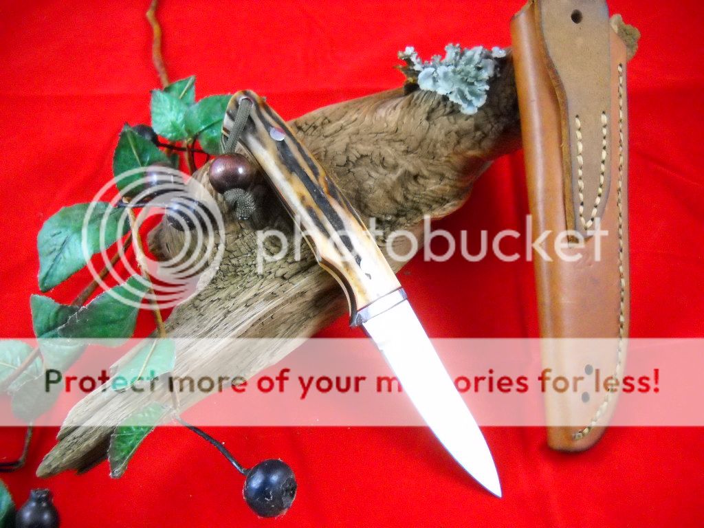 Tapered Tang, Stainless Hilt, Stag Scales & Red Liners.