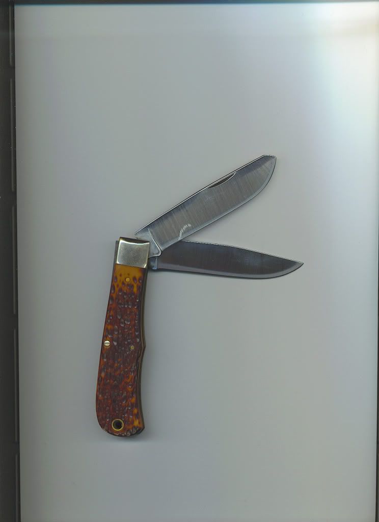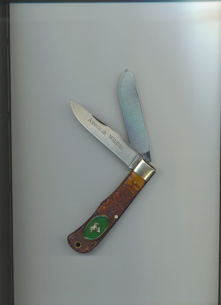 Camillus(USA) #10G(Mountain Sheep) - American Wildlife Series Large Trapper. Pewter emblem. 4.5in. Closed with Two 3 5/8in. 440A stainless blades, Delrin handle. Purchased in the early 80's.