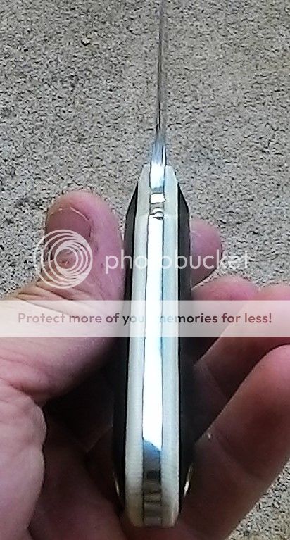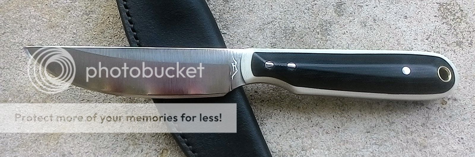 This bushcraft knife is made from AEB-L stainless steel. It is ground with a double hollow grind. The handle is made from black and white G10 with stainless steel pins and a brass lanyard tube.