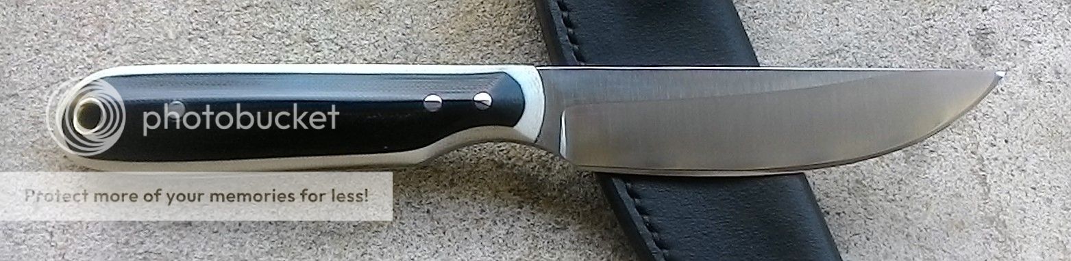 This cleaver is made from AEB-L stainless steel. The blade is ground with a double hollow grind. Its much like a straight razor. The handle is wrapped with black cotton cord that was soaked in resin. It comes with a black leather belt sheath.
